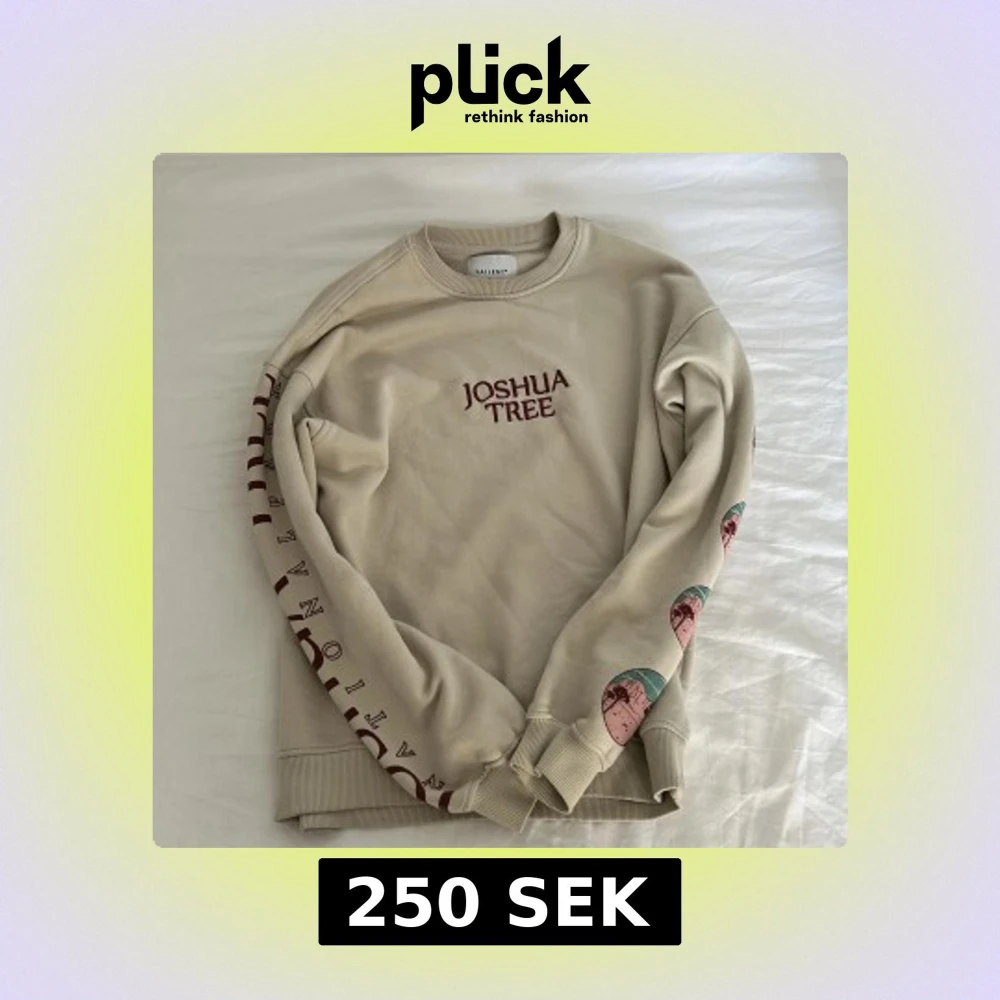 Snygg beige sweatshirt från Valient med tryck 'Joshua Tree' på bröstet och stort grafiskt motiv på ryggen. Ärmarna har små tryck i vinrött och flera runda illustrationer med naturtema i rosa, vinrött och turkos.