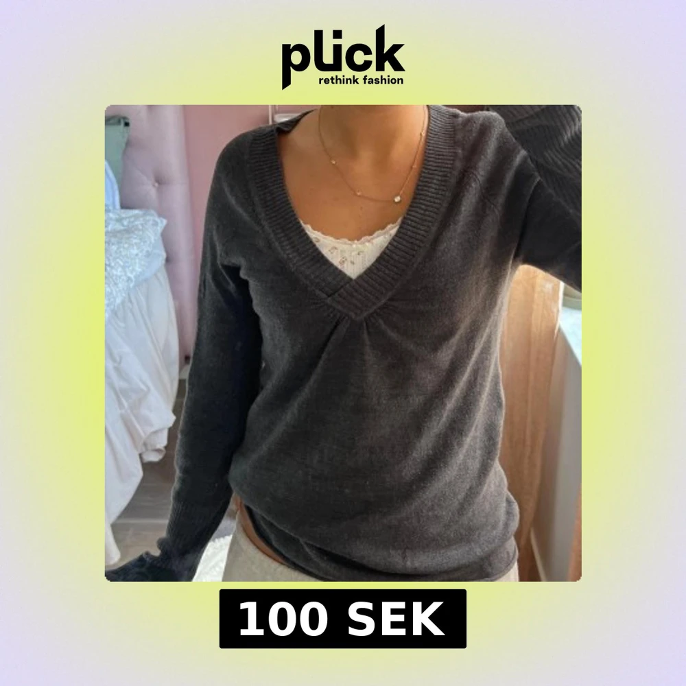 Säljer en mörkgrå stickad tröja med djup v-ringning och ribbade detaljer vid halsen, ärmslut och nederkant. Tröjan har lång ärm och en skön, normal passform som funkar perfekt till jeans eller mjukisbyxor.