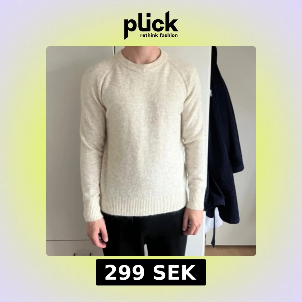 Säljer en stilren beige stickad tröja med rund halsringning och ribbade muddar. Tröjan har en klassisk passform och är perfekt för kyligare dagar. Enkel att matcha med olika outfits.