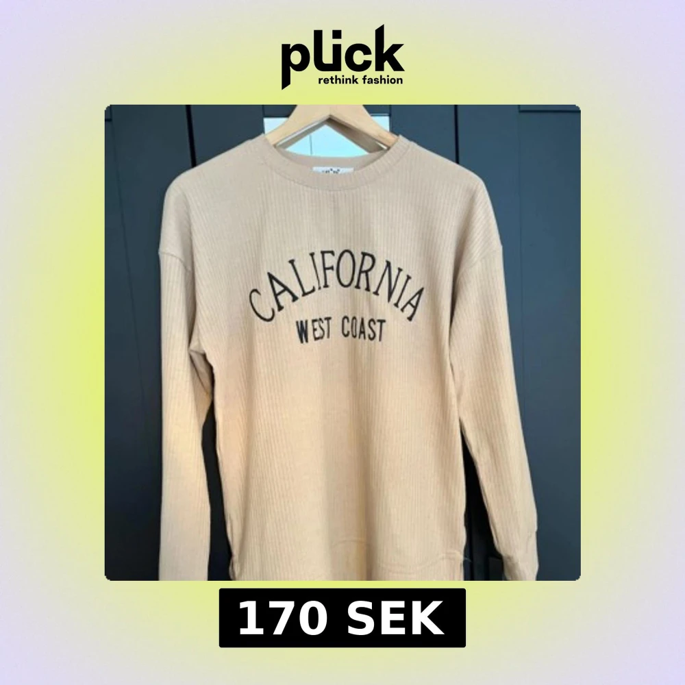 Beige ribbad långärmad tröja med svart text 'California West Coast' på bröstet. Tröjan har rund halsringning och är gjord i ett mjukt, stretchigt material. Perfekt för en avslappnad och trendig look.