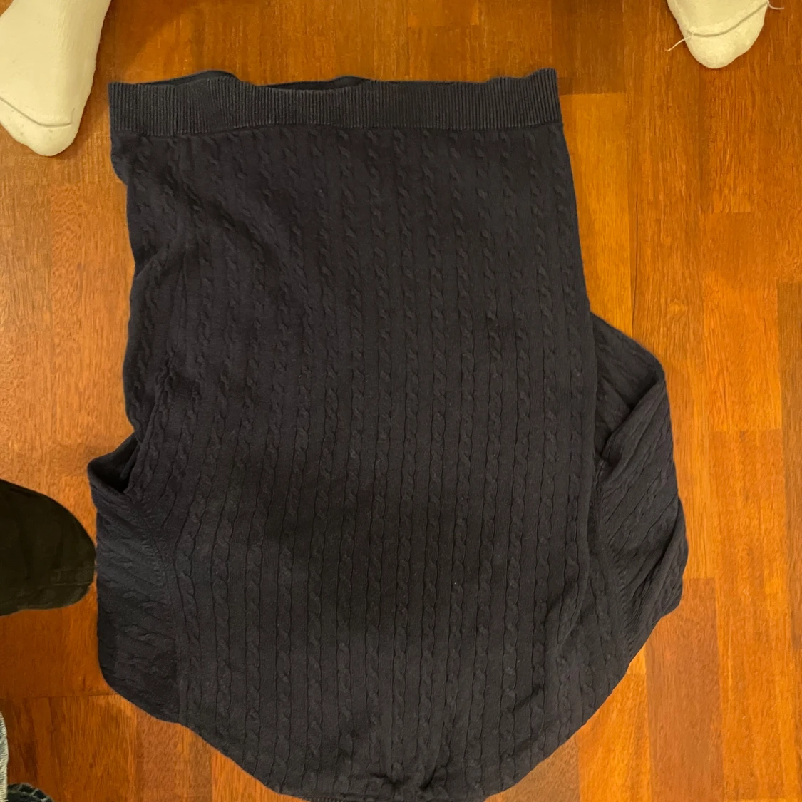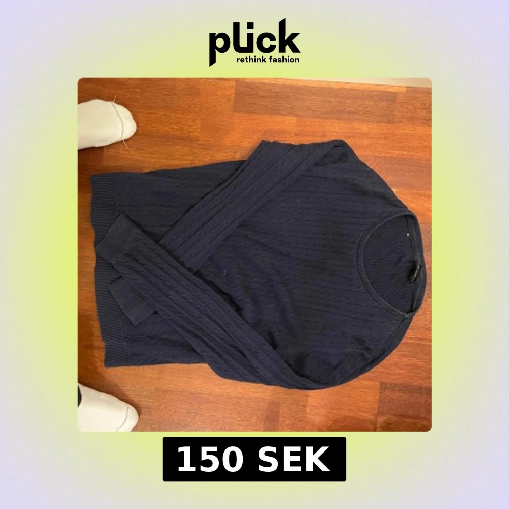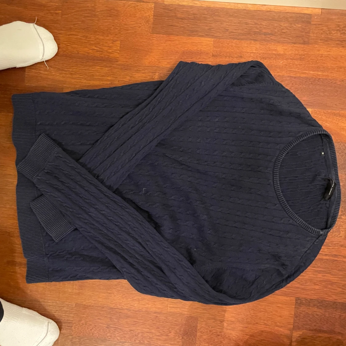 Säljer en stilren mörkblå stickad tröja med ett diskret kabelmönster. Tröjan har långa ärmar och ribbade muddar vid ärmslut och nederkant. Perfekt för kyligare dagar.