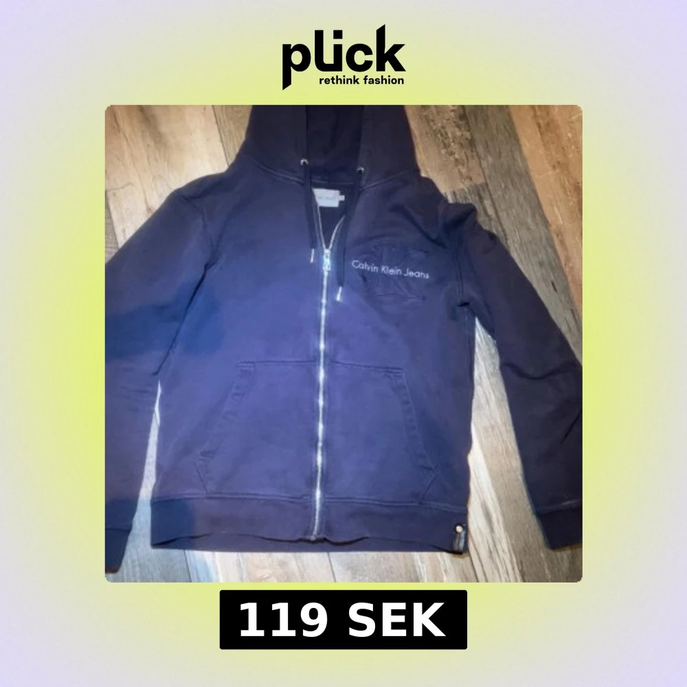 Säljer en snygg mörkblå hoodie från Calvin Klein Jeans med dragkedja och broderad logga på bröstet. Perfekt för en avslappnad stil. Den har en praktisk huva och fickor framtill.
