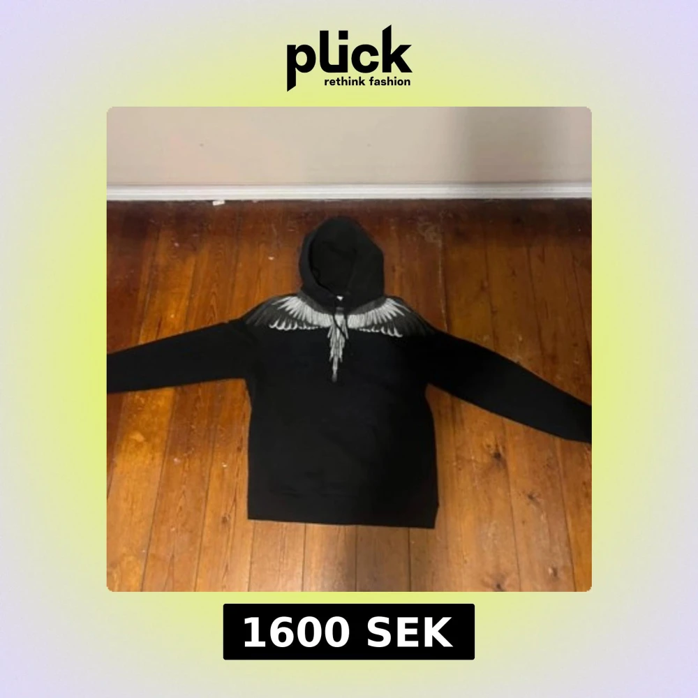 Snygg svart hoodie från Marcelo Burlon med ett unikt vingmönster i vitt och grått över axlarna. Perfekt för en stilren och modern look. Perfekt för en lite mer avslappnad och stilig vardag.