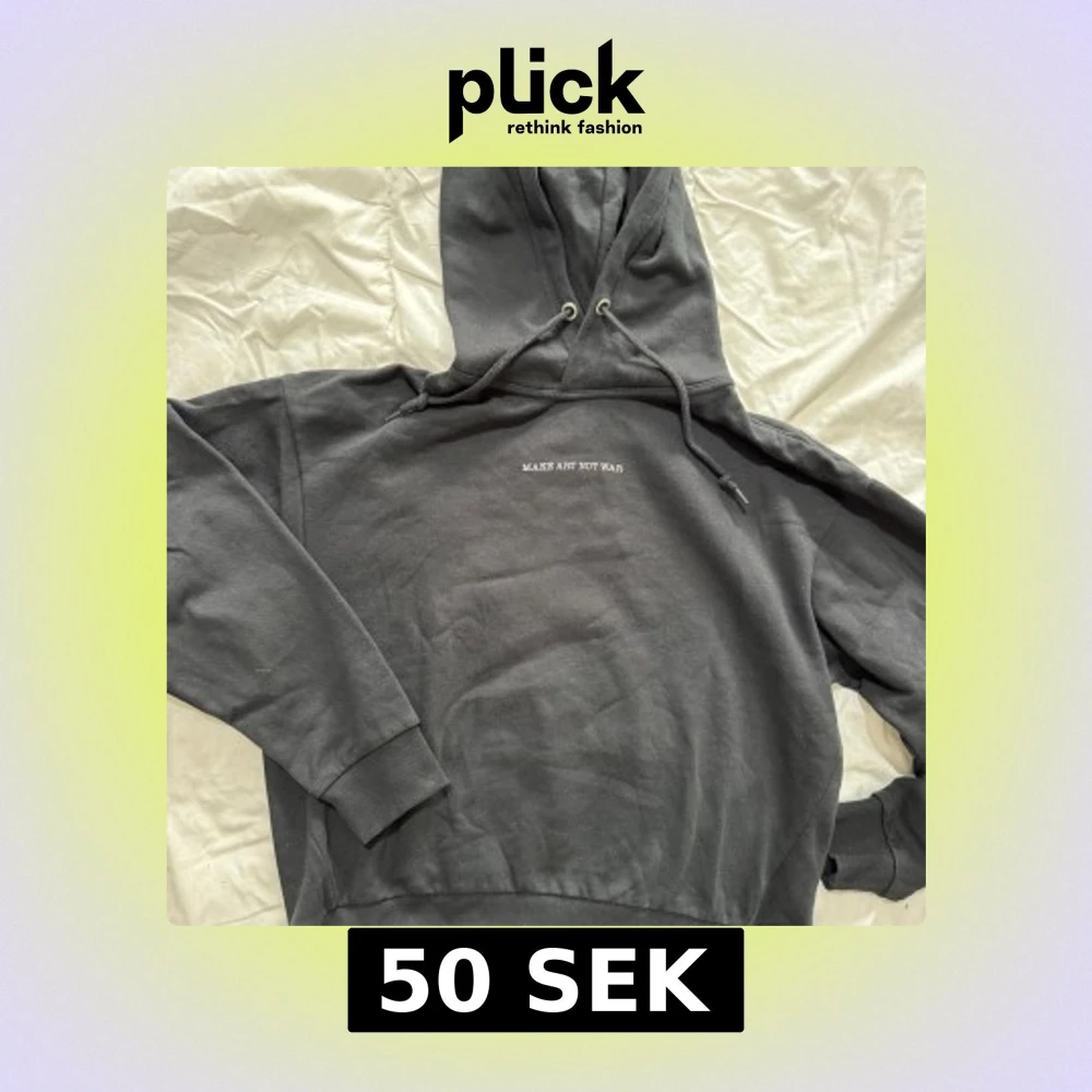 Säljer en svart hoodie med texten 'MAKE ART NOT WAR' på framsidan och ett stort fredsmärke på baksidan. Hoodien har en justerbar huva och långa ärmar med ribbade muddar.
