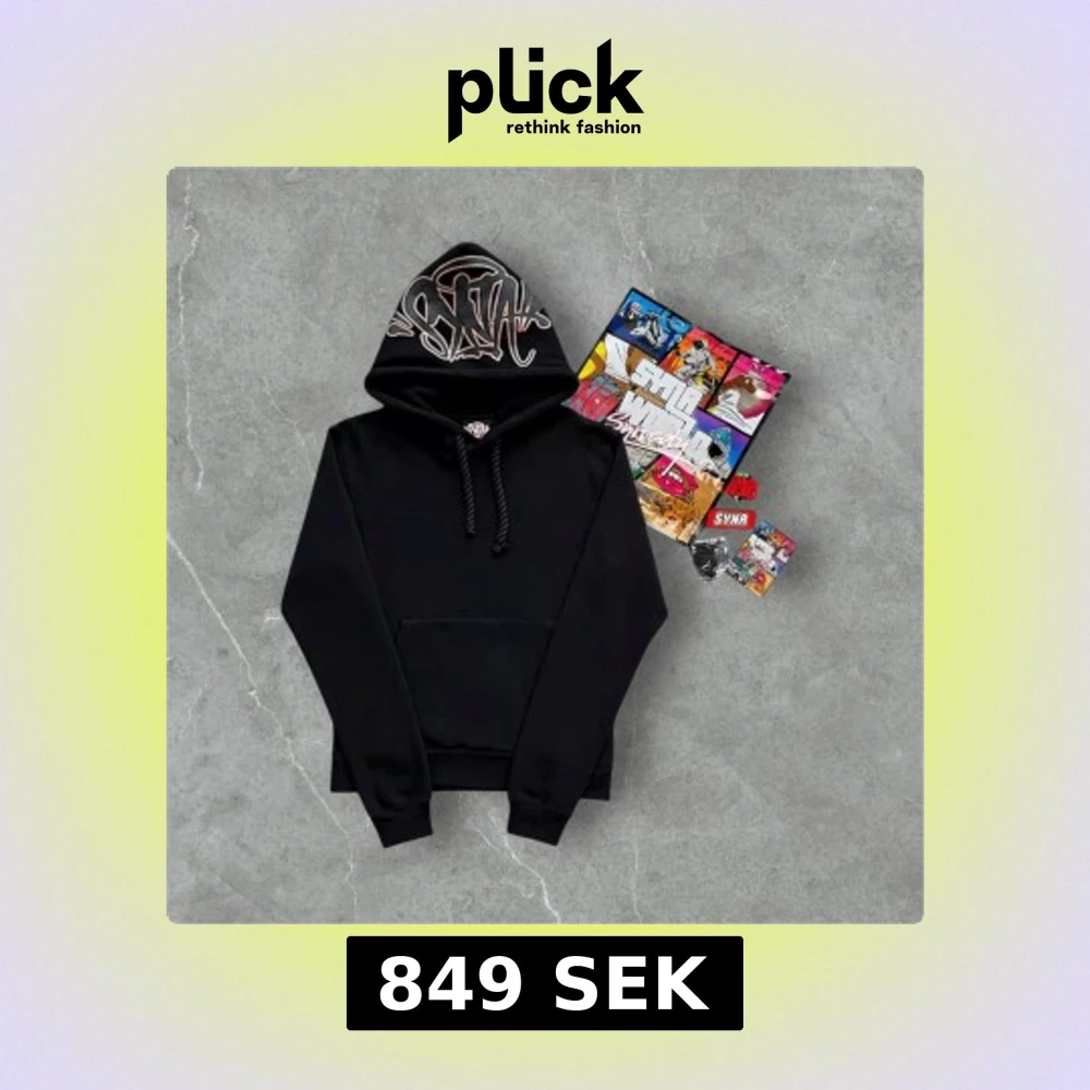 Svart hoodie från Syna med fett graffiti-tryck på huvan. Tröjan har snörning i huvan, stor magficka och mjukt fleecefoder på insidan. Materialet är 80% bomull och 20% polyester, perfekt för dig som gillar streetwear och vill sticka ut.
