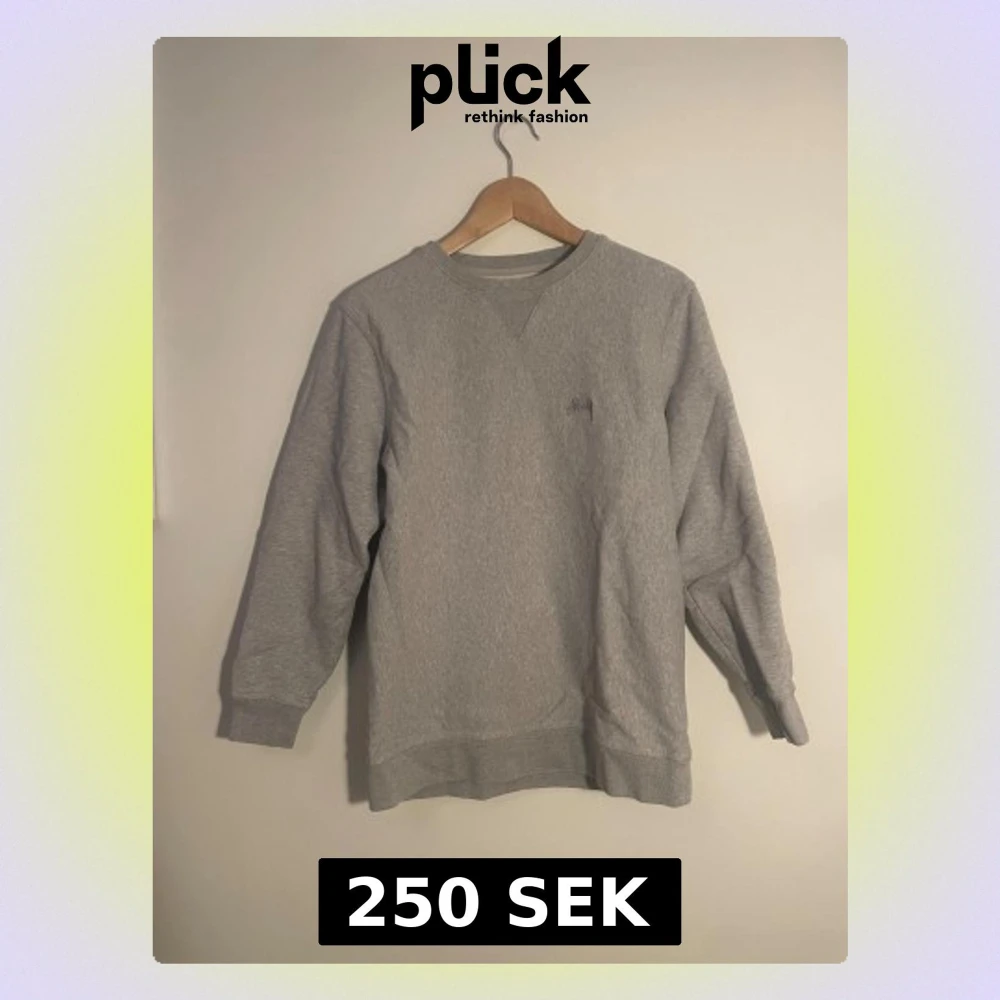 Säljer en grå sweatshirt från Stüssy i storlek M. Tröjan har ett litet Stüssy-logo broderat på bröstet, ribbade muddar och rund hals. Mjuk insida och klassisk passform. Materialet är bomull och polyester.