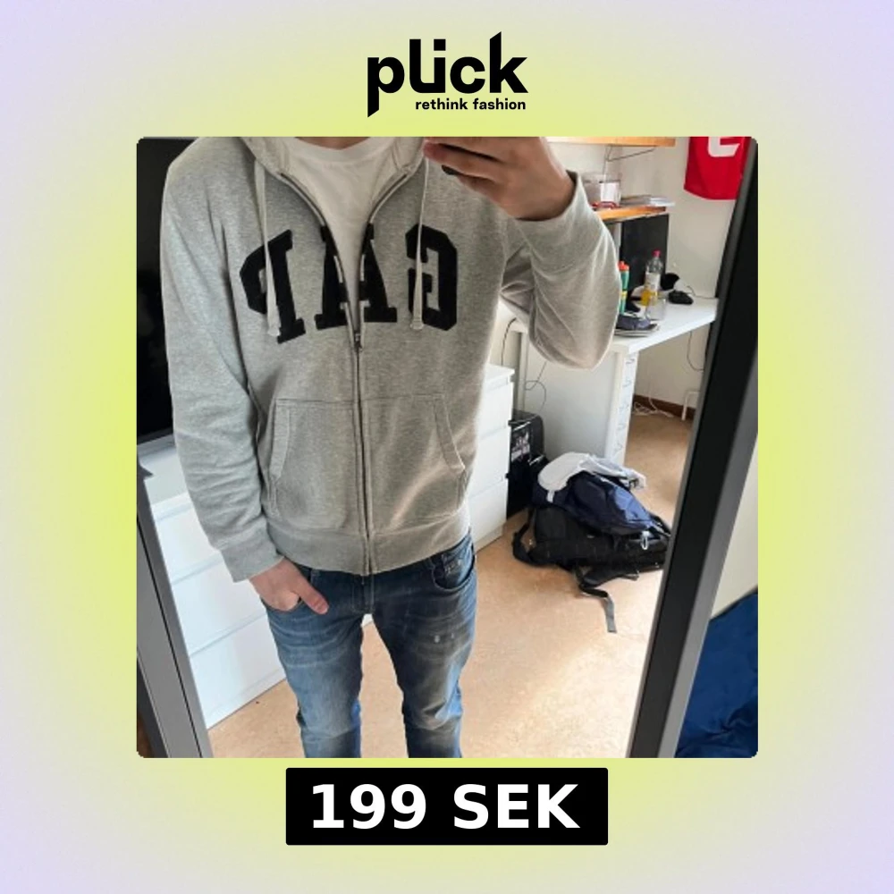 Säljer en grå hoodie från GAP med dragkedja och stor logga på bröstet. Tröjan har en bekväm passform i storlek M. Hör av dig vid fler frågor🙏🏼