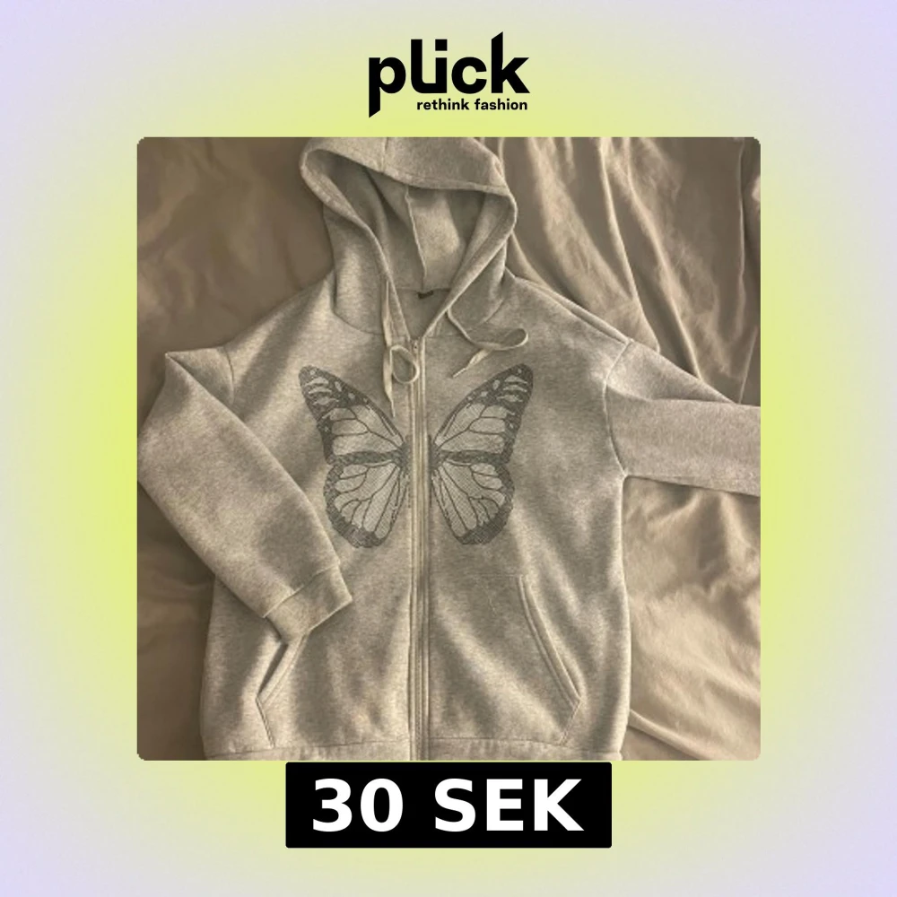Grå hoodie med dragkedja och stor glittrig svartvit fjäril på framsidan. 💙