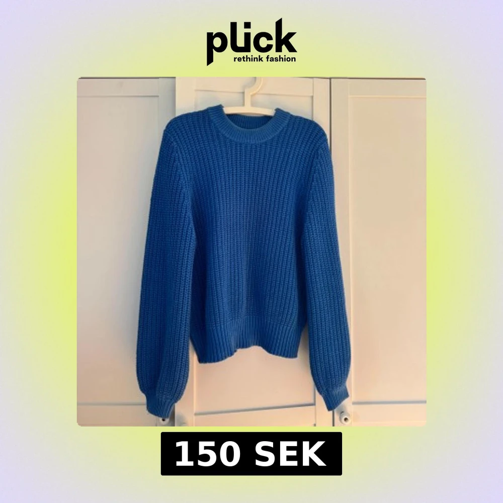 Säljer en blå stickad tröja med grov struktur och rund halsringning. Tröjan har långa ärmar och breda muddar vid ärmslut och nederkant.