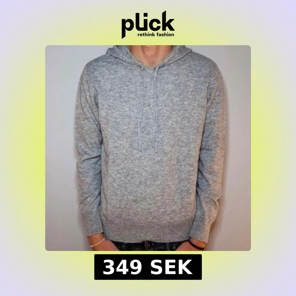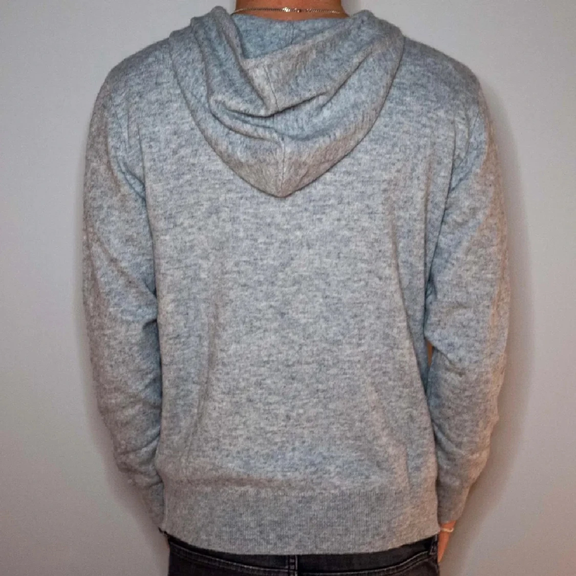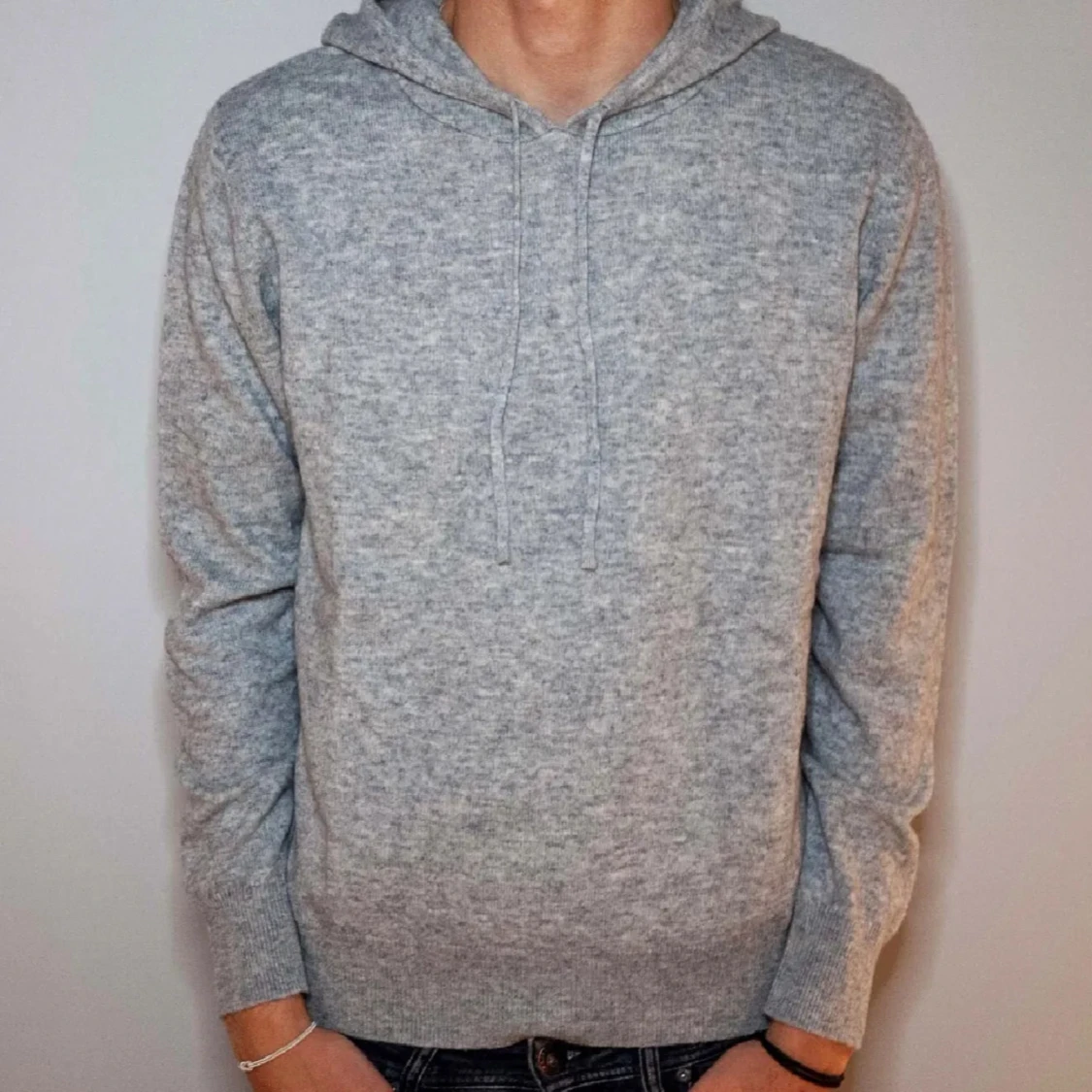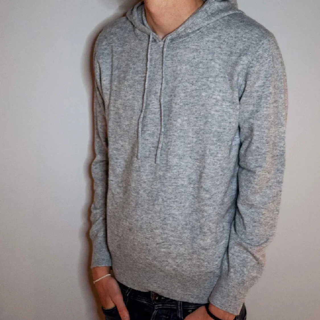 Mysig grå stickad hoodie med huva och snörning. Tröjan har lång ärm och ribbade muddar vid ärmslut och nederkant. Perfekt för kyliga dagar och enkel att matcha med jeans eller joggers.