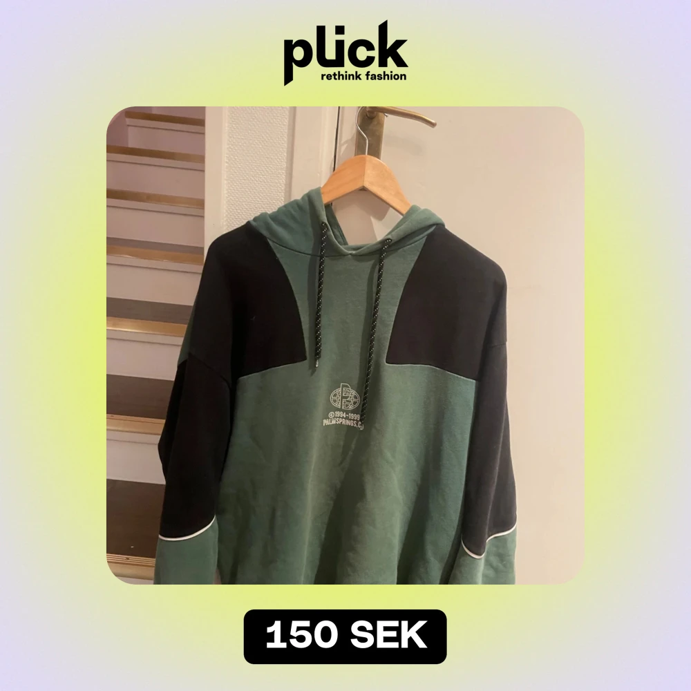 Säljer en snygg grön hoodie från asos med svarta detaljer på ärmar och axlar. Den har en justerbar huva med snören och en cool logga på bröstet.