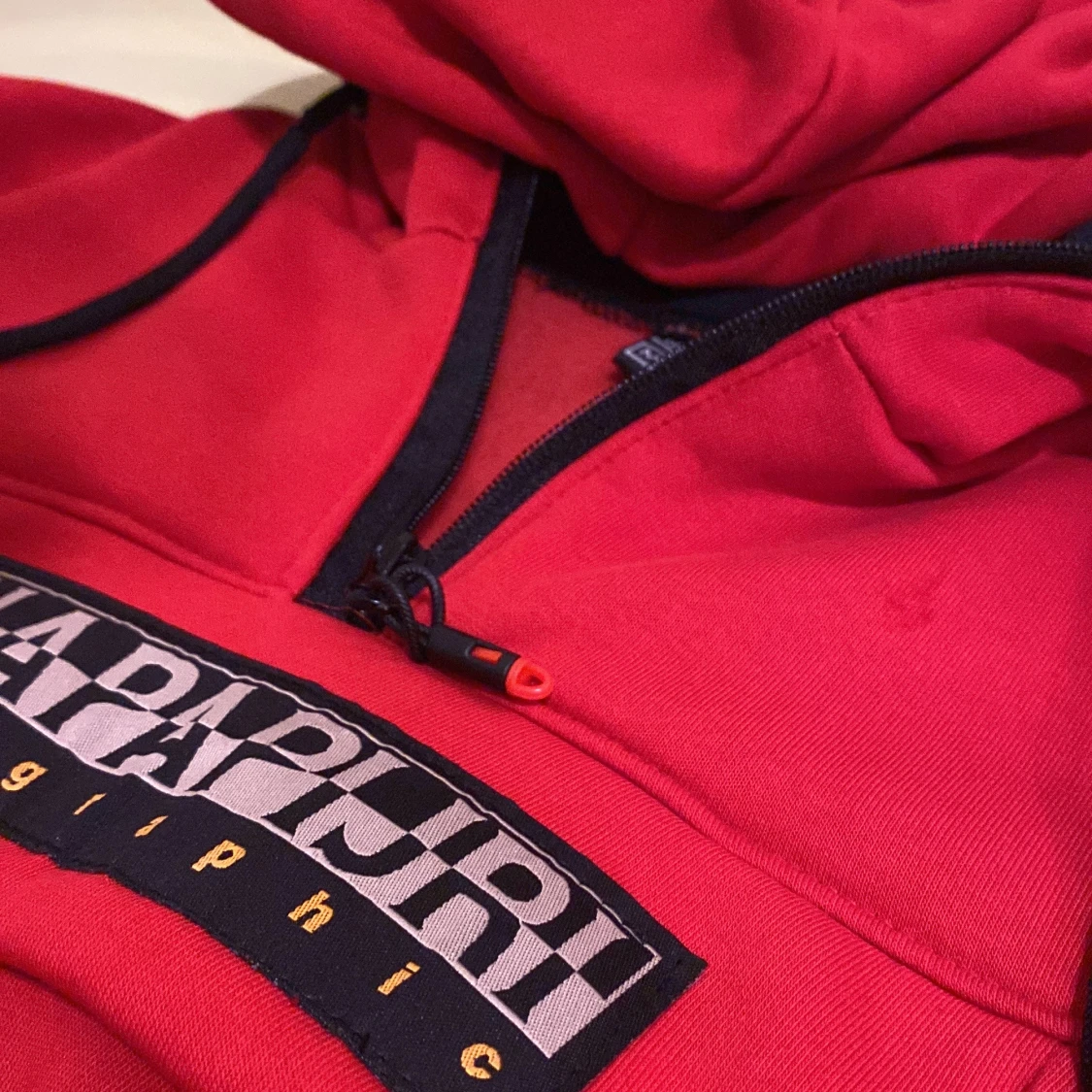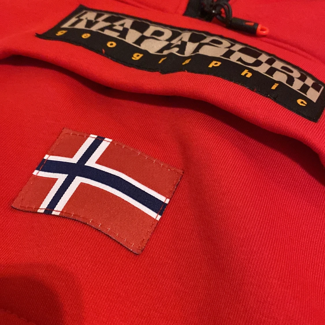 Snygg röd hoodie från Napapijri med dragkedja och norsk flagga på framsidan. Perfekt för kyliga dagar med sin bekväma passform och stilrena design.