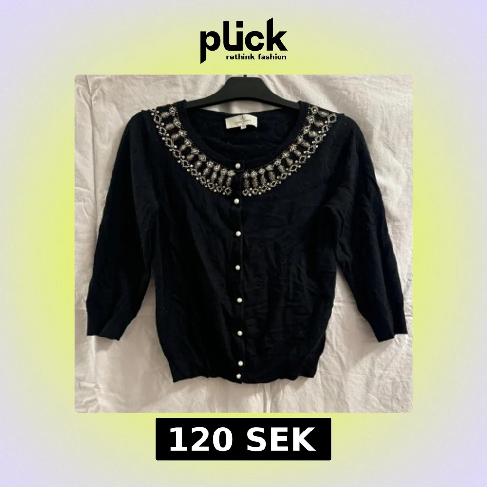 Elegant svart kofta från Flash Woman med vackra pärldetaljer runt halsringningen. Koftan har trekvartsärmar och knäpps med pärlknappar framtill. Perfekt för att ge en stilfull touch till din outfit.