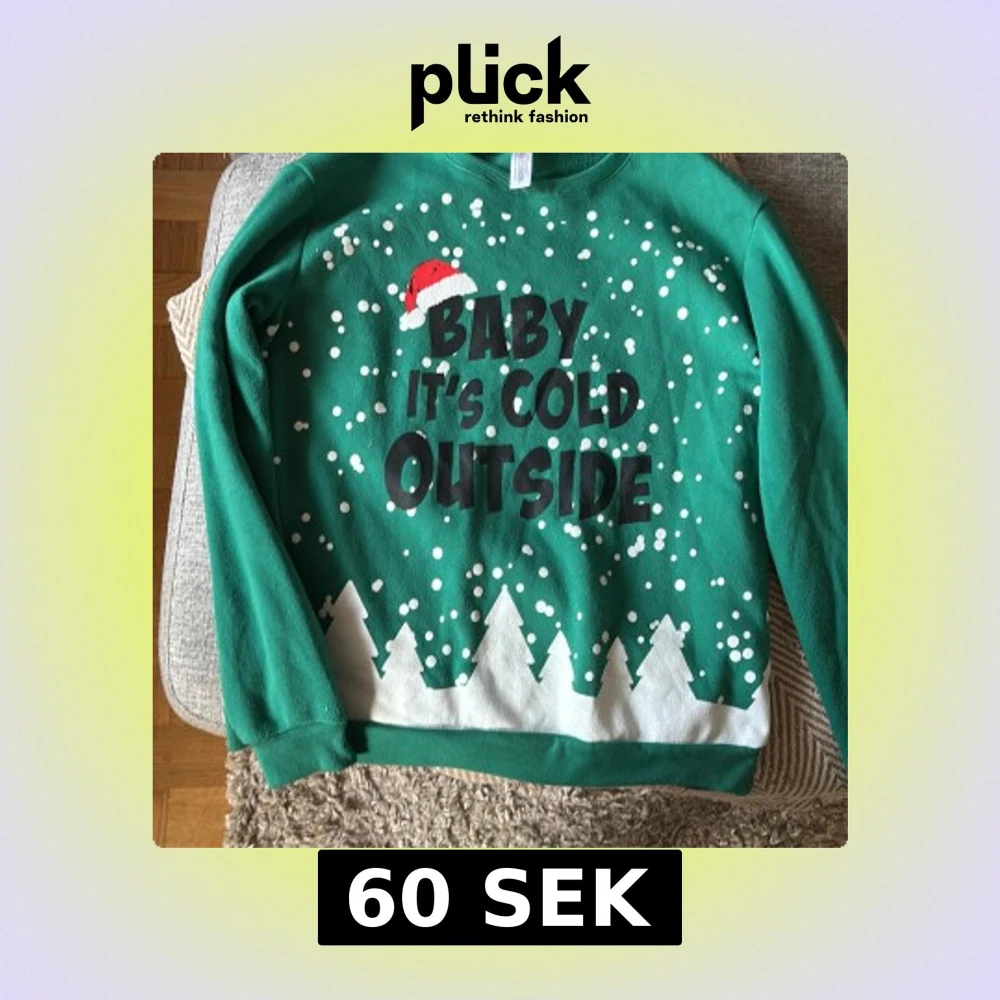 Rolig grön jultröja med texten 'Baby it's cold outside' och snöflingor samt vita granar längst ner. Trycket har även en liten tomteluva. Tröjan är långärmad och tillverkad i 100% polyester, perfekt för att maxa julstämningen. Lite noppig på armarna