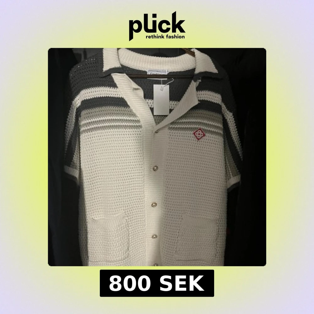 Stickad skjorta med korta ärmar från Casablanca i vit och mörkgrå färg. Skjortan har knappar framtill, två fickor och ett broderat rött märke på bröstet. Snygg krage och coolt randigt mönster upptill ger en retro vibe.