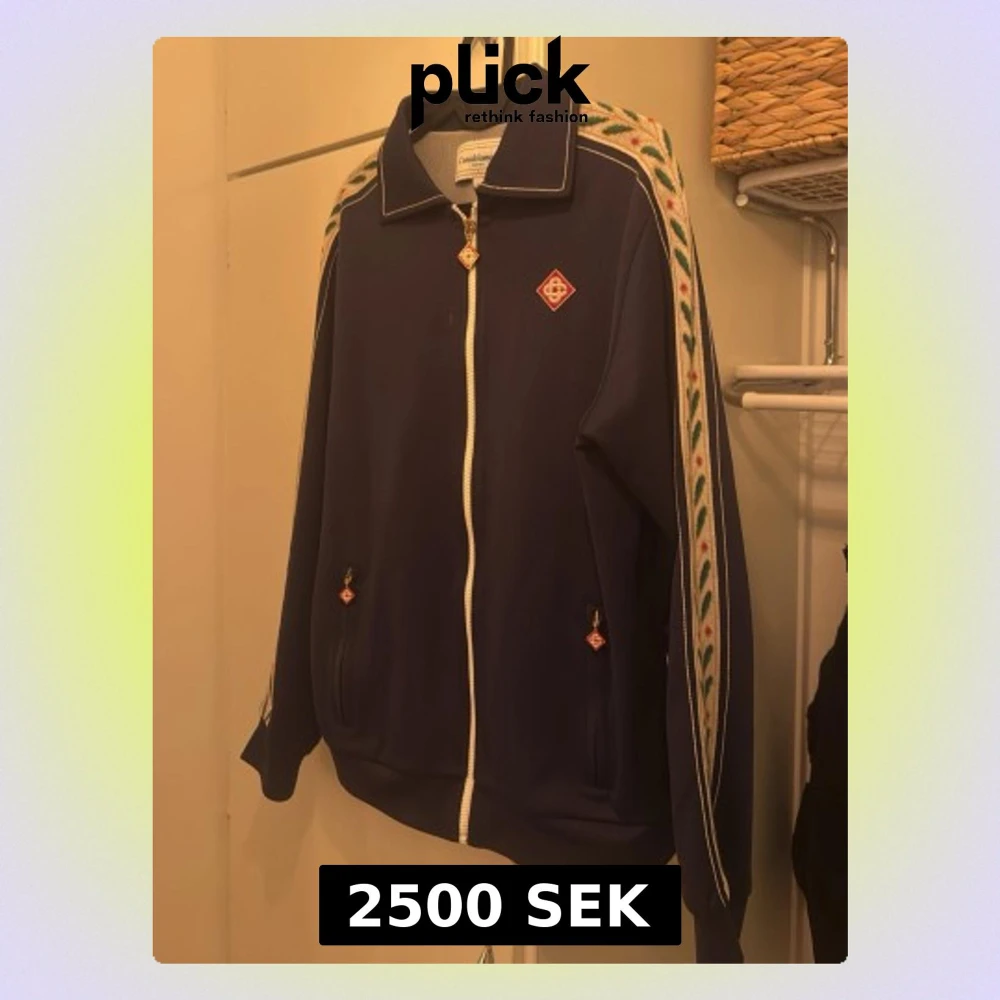 Snygg blå ziptröja från Casablanca Tennis Club med vita detaljer och dekorativa band i grönt och rött längs ärmarna. Tröjan har dragkedja med logga, två fickor och klassisk krage. Perfekt för en sportig och trendig look. Storlek L men är som M