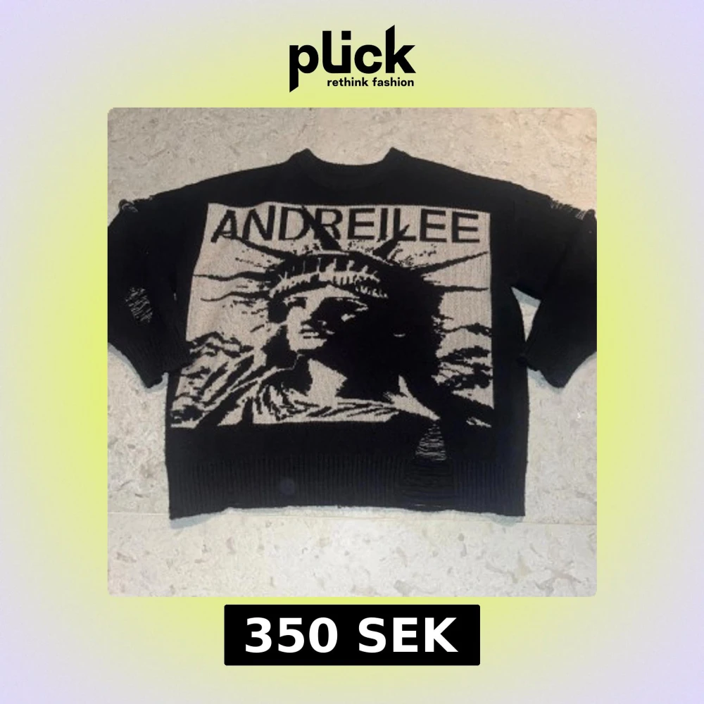 Cool svart stickad tröja från ANDREILEE med stor beige print av Frihetsgudinnan på framsidan. Tröjan har lång ärm, ribbade muddar och slitna detaljer för en edgy look. Perfekt för dig som gillar streetstyle och statement-plagg.