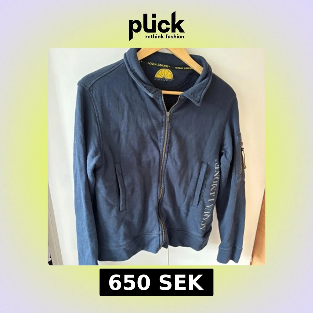 Säljer en mörkblå hoodie från Acqua Limone med dragkedja och stor gul logga på ryggen. Tröjan har långa ärmar, fickor på sidorna och en extra ficka med dragkedja på ena ärmen. Perfekt för chill dagar och snygg streetstil.