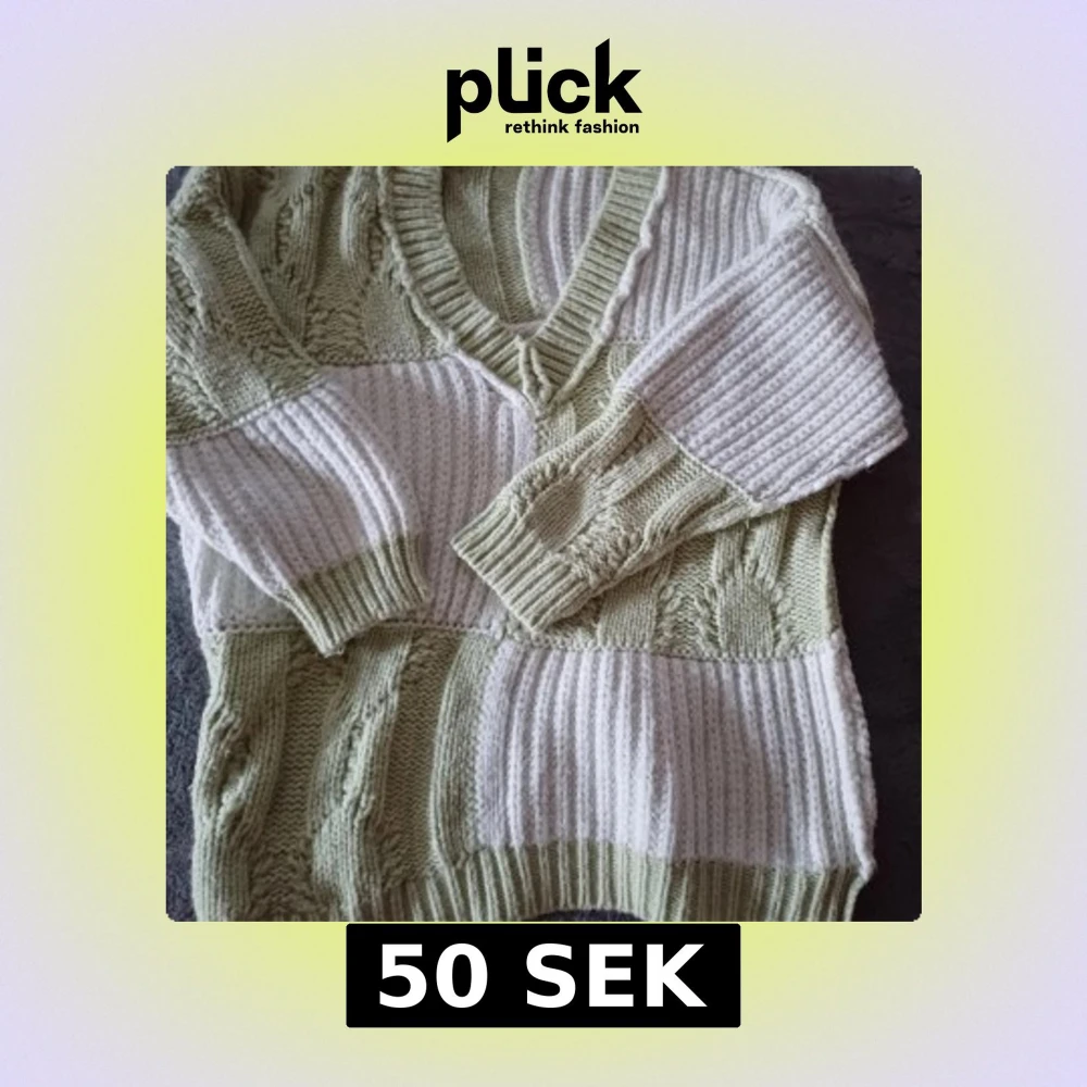 Mysig stickad tröja med v-ringning i blockmönster av ljusgrön och vit. Tröjan har grov ribbstickning blandat med flätstickade partier och långa ärmar. Perfekt för dig som gillar en chill och trendig look.