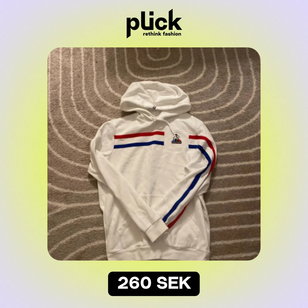 Säljer en snygg vit hoodie från Le Coq Sportif i storlek M. Den har coola röda och blå ränder över bröstet och längs ena ärmen. Perfekt för en sportig look eller bara för att chilla. Den är i bra skick och superbekväm!