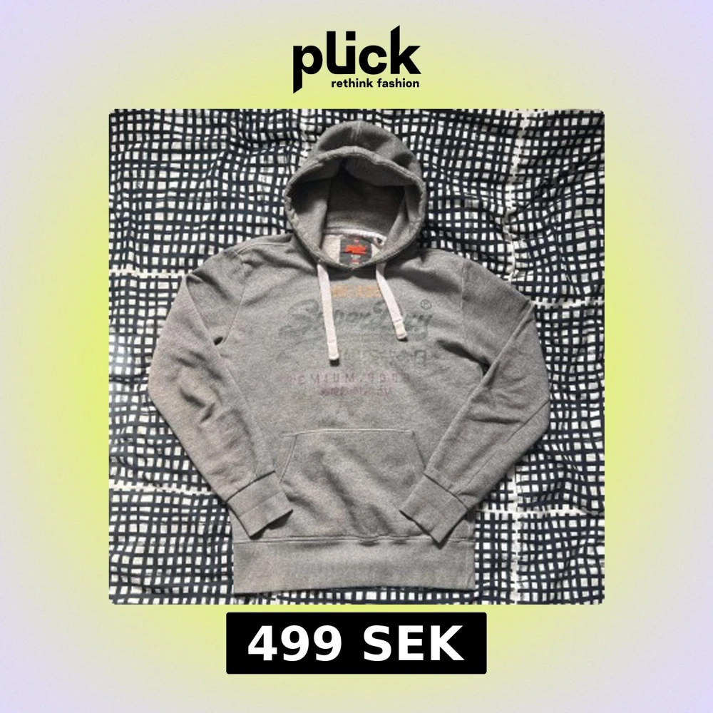 Säljer en grå hoodie från Superdry med tryck på framsidan. Den har en klassisk känguruficka och justerbar huva med snören. Perfekt för en avslappnad stil.