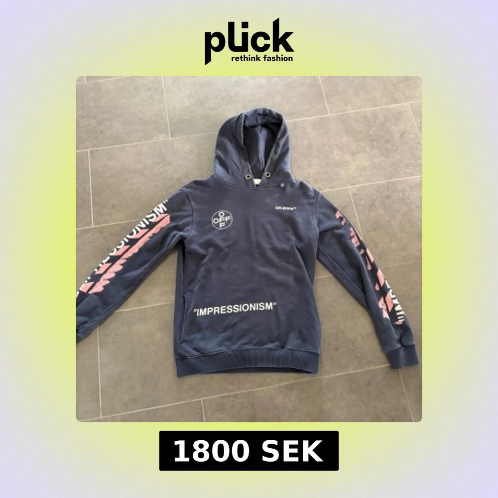 Säljer en blå hoodie från Off-White med huva och feta tryck i vitt och rosa på både ärmar, bröst och rygg. Stora grafiska detaljer och texten 'IMPRESSIONISM' ger en riktigt street vibe. Perfekt för dig som vill sticka ut med en ikonisk look.