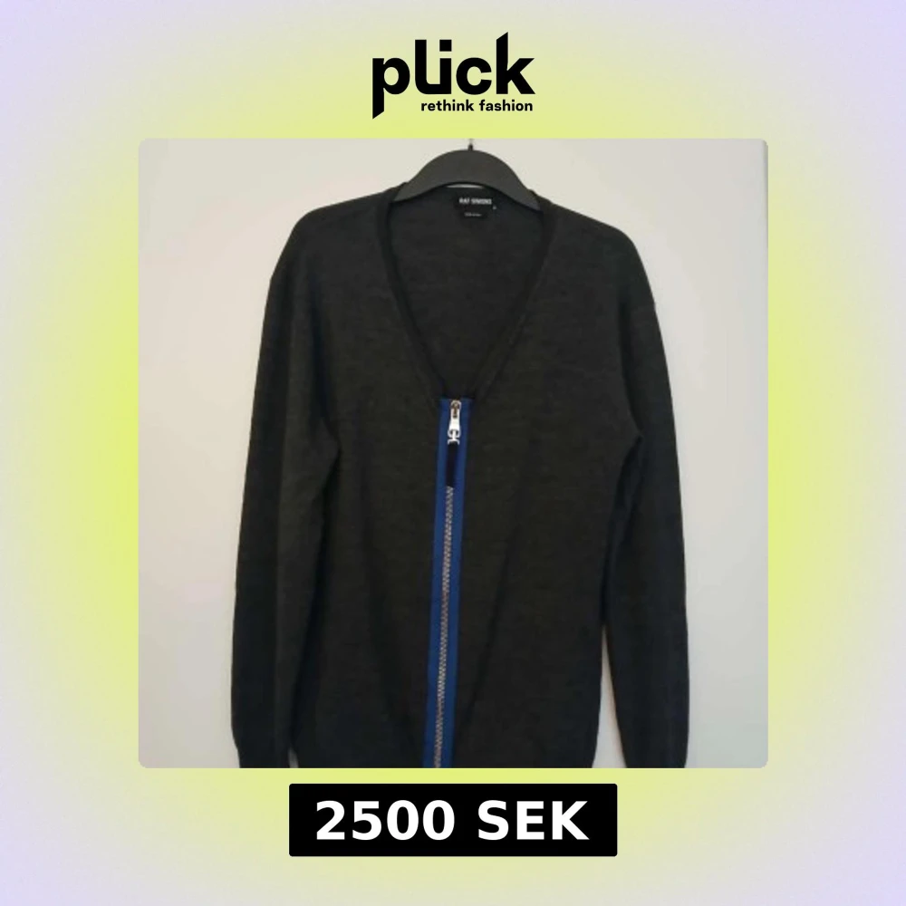 Säljer en svart kofta från Raf Simons med unik blå detalj längs dragkedjan framtill. Koftan har v-ringning, lång ärm och är tillverkad i ett tunt, stickat material. Perfekt för dig som gillar stilrena plagg med en twist.