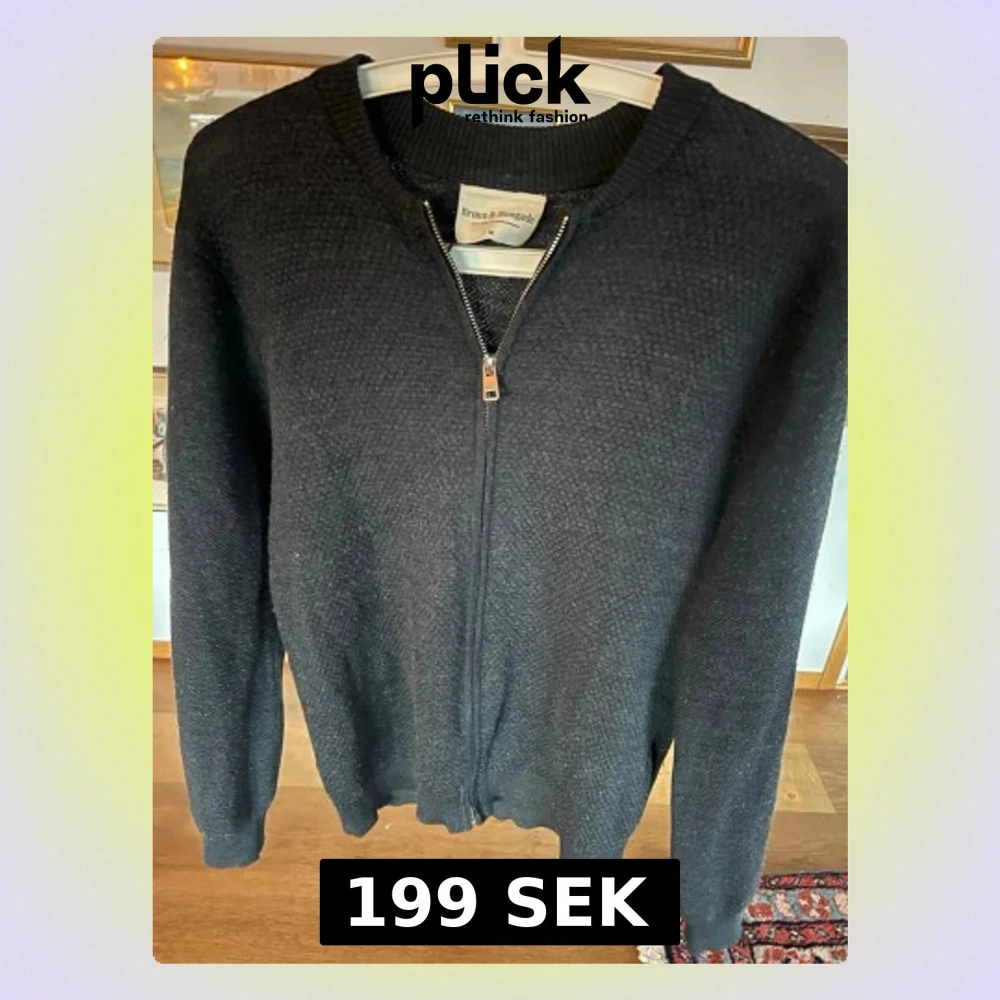 Klassisk svart stickad kofta från Bruun & Stengade med hel dragkedja framtill. Tröjan har rund halsringning och långa ärmar. Perfekt till lager på lager och enkel att matcha med olika outfits. Bra skick lite nopprig bara. Storlek M
