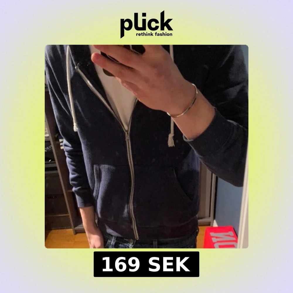 Säljer en mörkblå hoodie med vit snörning och dragkedja framtill. Tröjan har huva, två fickor och ribbade muddar vid ärmslut och nederkant. Perfekt för chill dagar och enkel att matcha med jeans eller joggers. Pris kan diskuteras vid snabb affär🤝