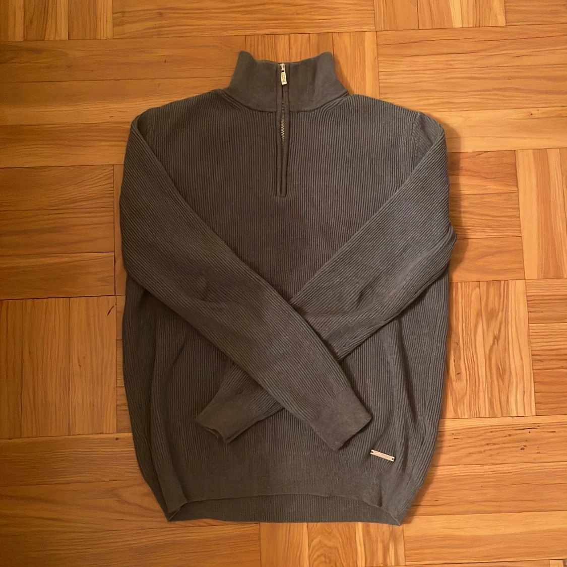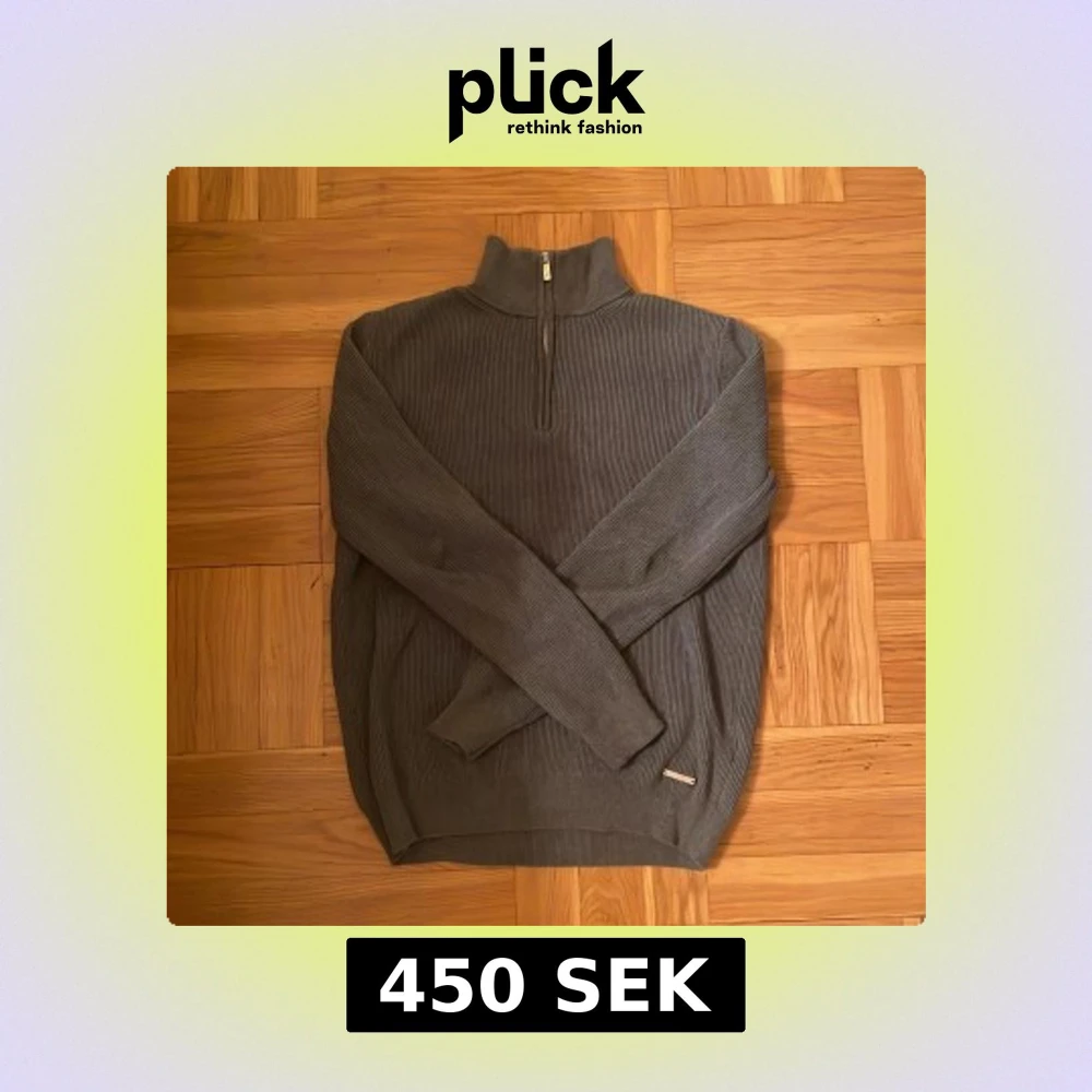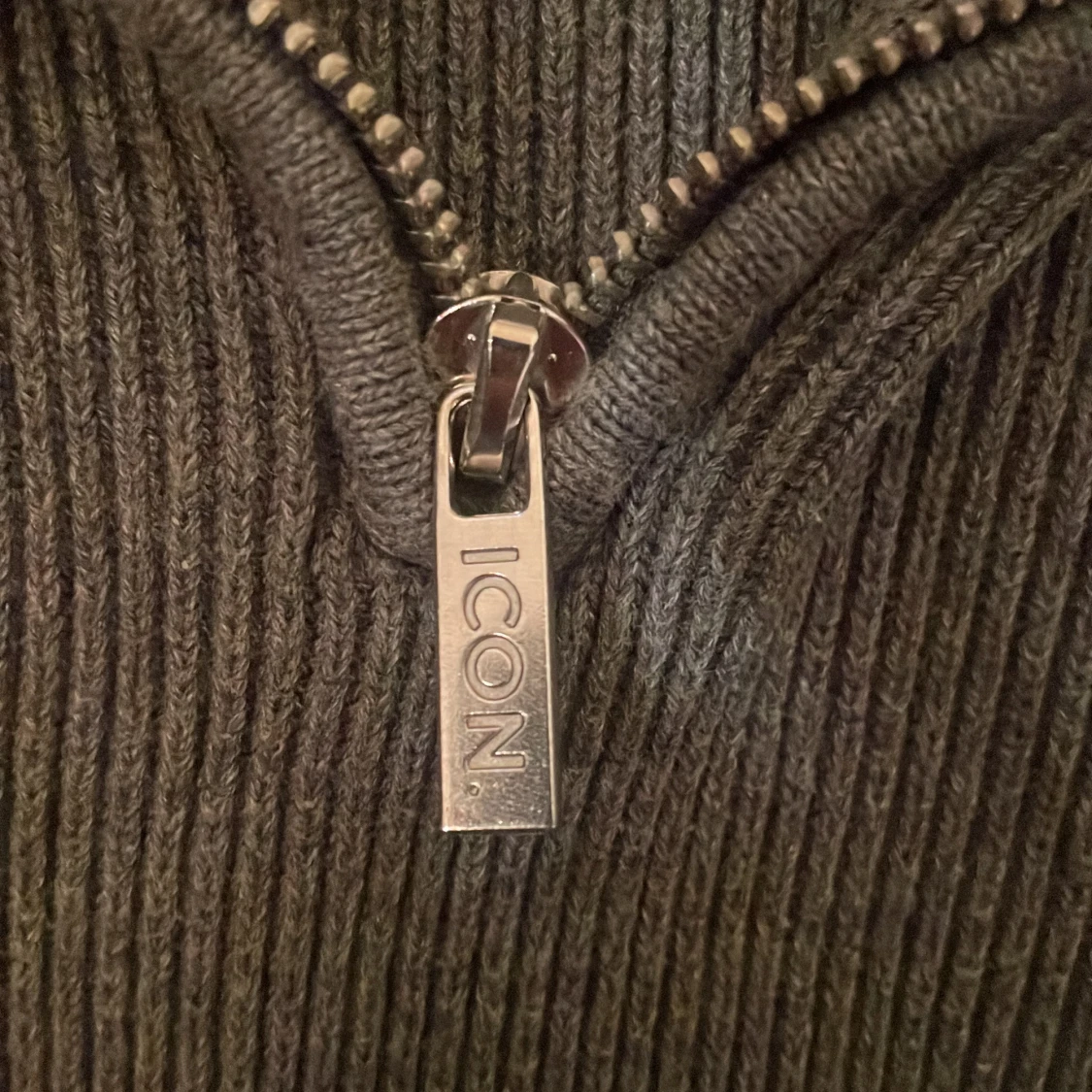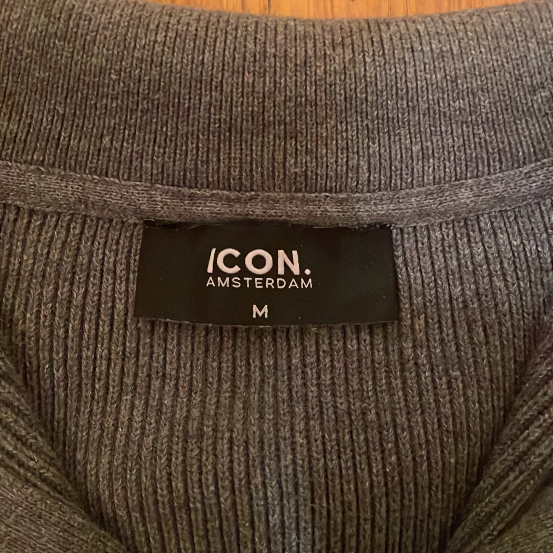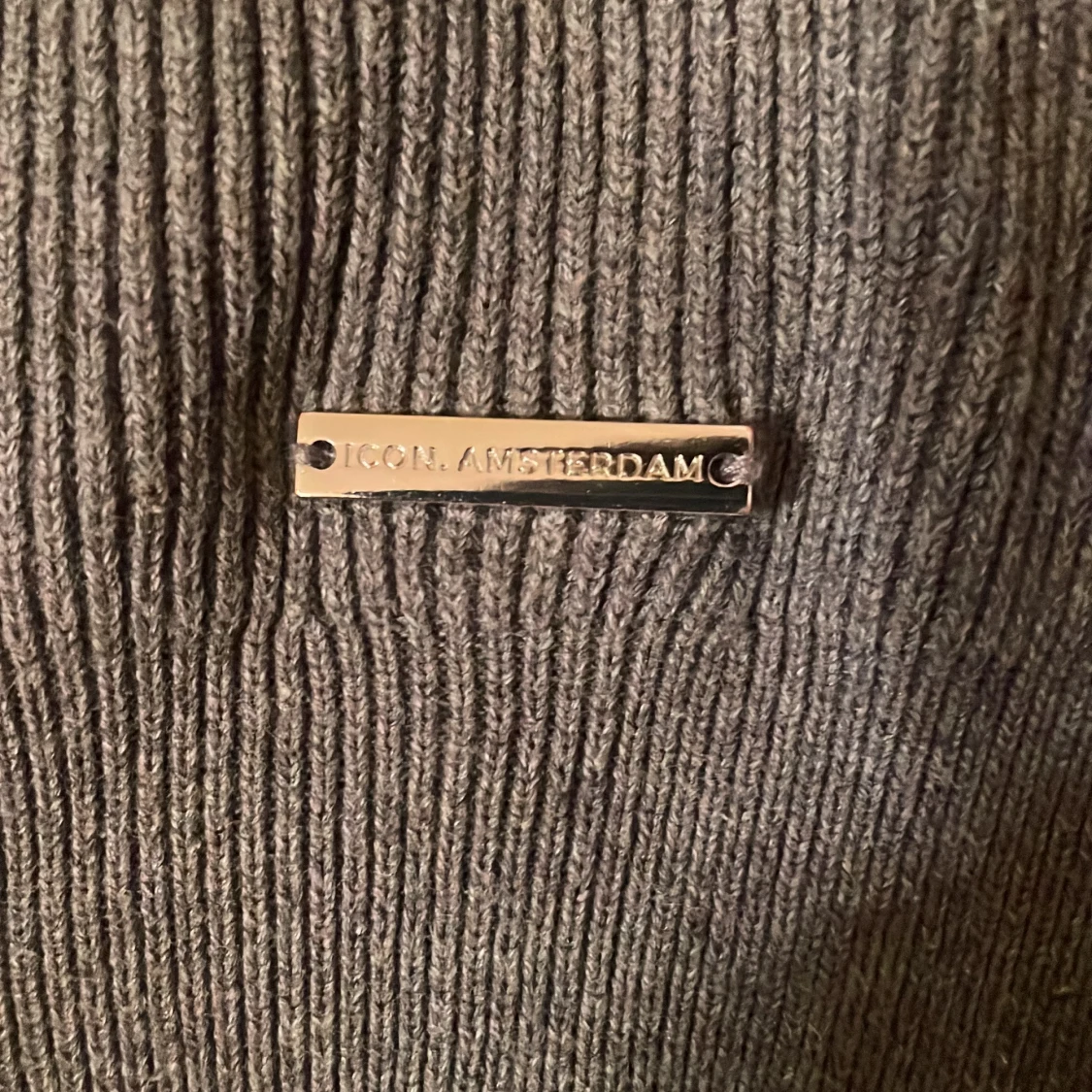 Snygg grå ribbstickad tröja från ICON Amsterdam i storlek M. Tröjan har en hög krage med half zip-dragkedja och diskret metallogo vid nederkanten. Perfekt för lager-på-lager och chill stil under höst och vinter.