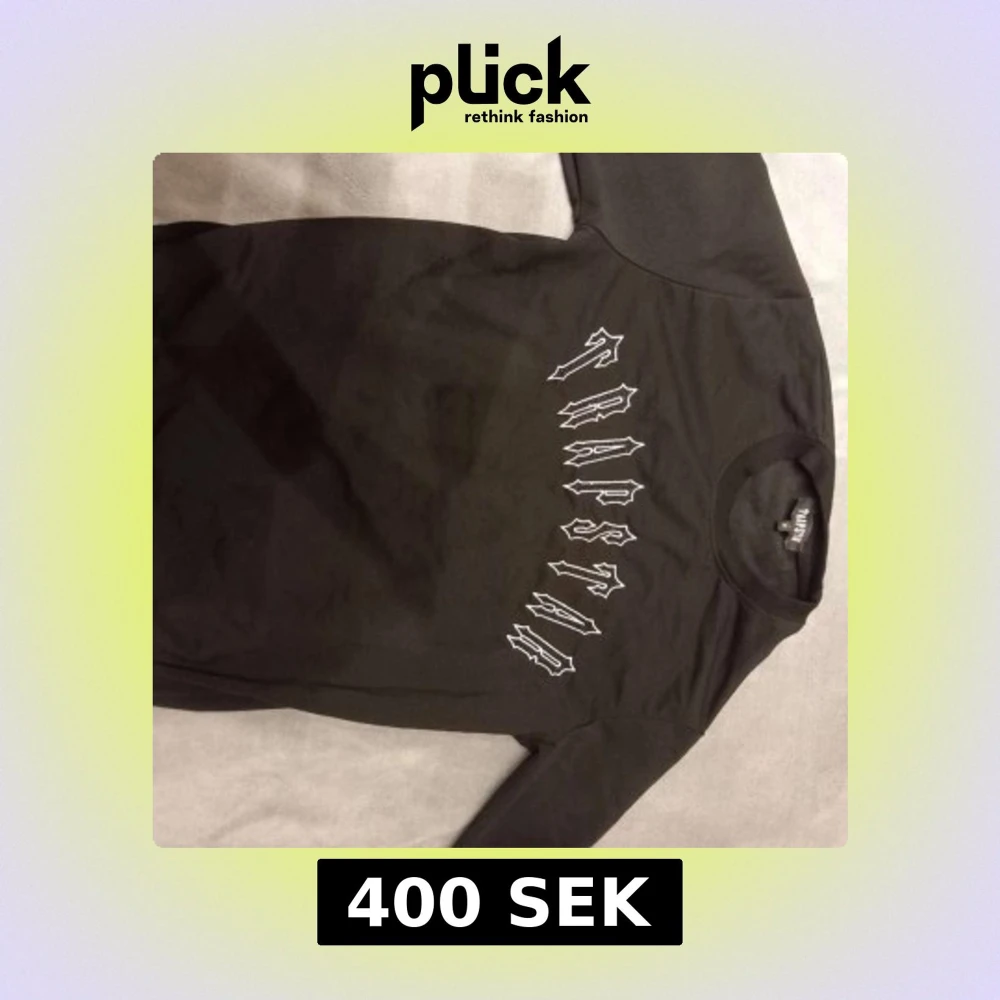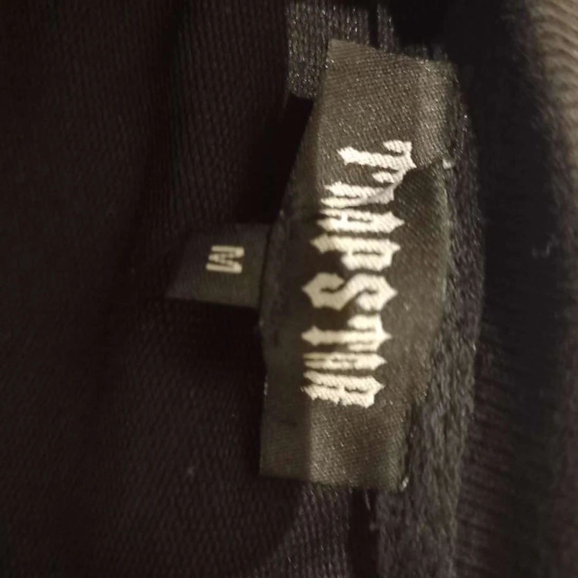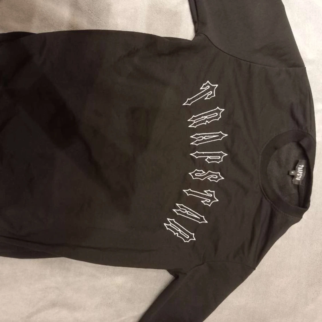 Säljer en svart swetter från Trapstar med vit broderad logga i gotisk stil på bröstet. Klassisk passform och rund halsringning. Perfekt för dig som gillar streetwear och skatekultur.storlek medium