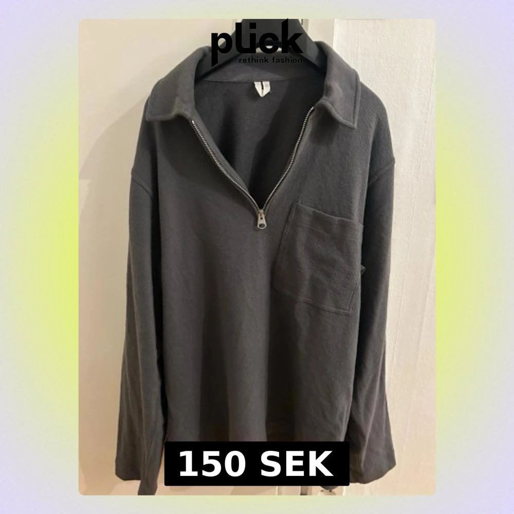 Mörkgrå långärmad tröja med stor krage och half zip-dragkedja framtill. Tröjan har en bröstficka på vänster sida och är gjord i mjukt bomullstyg. Passar perfekt för chill dagar och har en relaxed vibe.