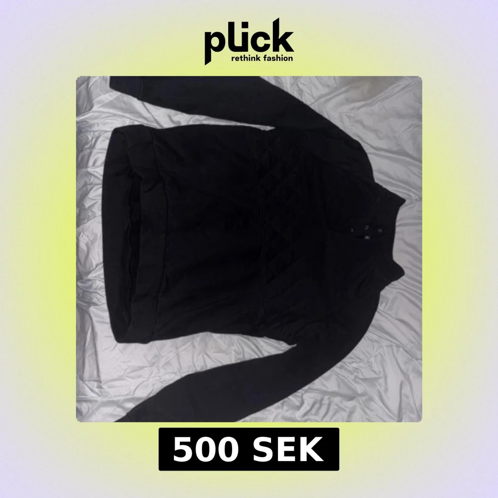 Snygg svart tröja med quiltad detalj över bröstet och knappar vid halsen. Perfekt för kyligare dagar.