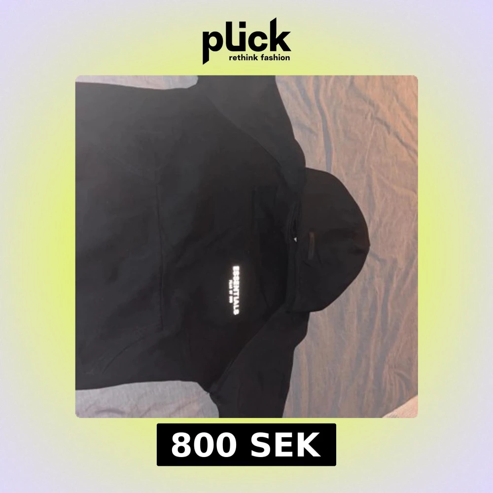 Säljer en stilren svart hoodie från Essentials Fear of God. Den har en klassisk design med logotypen tryckt på bröstet och ärmen. Perfekt för en avslappnad look.