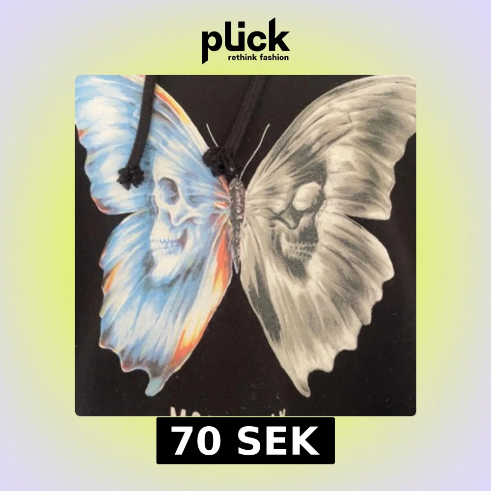 Svart hoodie från Smog med stor fjäril på bröstet där ena vingen är blå och andra grå, båda med coola dödskallemotiv. Tröjan har huva med snörning och är perfekt för dig som gillar unika tryck och streetstyle.