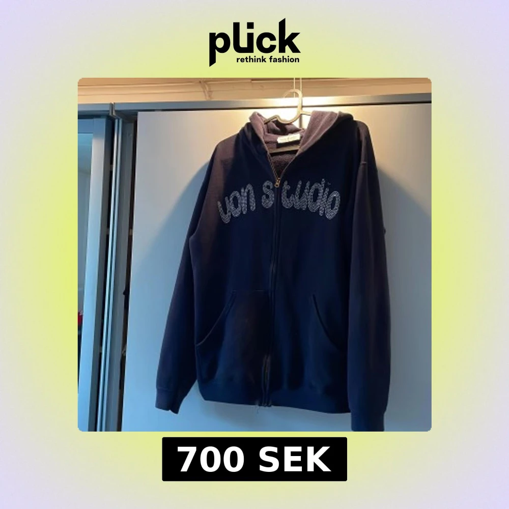 Snygg mörkblå hoodie från Vain Studio med dragkedja och glittrig text på framsidan. Baksidan har ett coolt motiv i samma stil. Perfekt för en avslappnad stil. Passar dig som bär storlek M-L. Denna tröja från von studio är limited edition och säljs därför inte nånstans längre. Köpt för 1500kr. Denna modell är alltså extremt sällsynt.