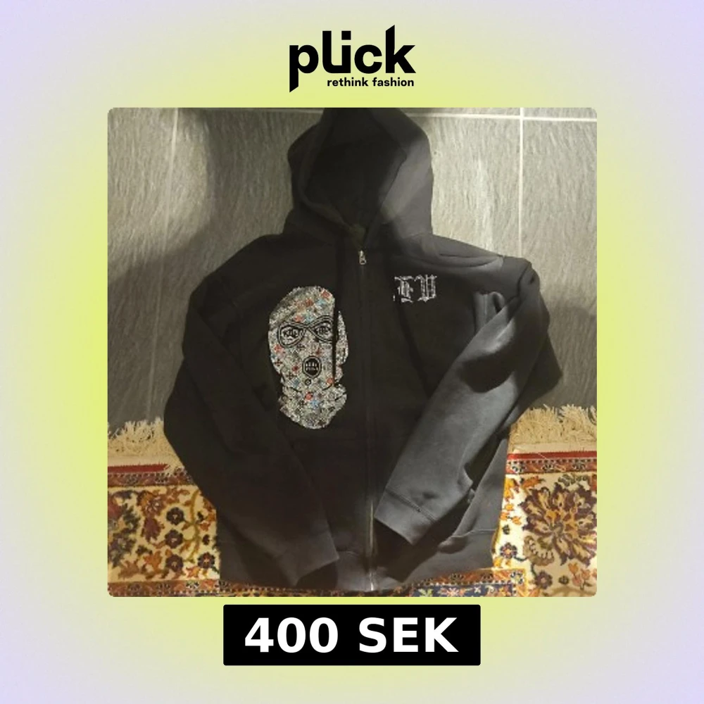 Svart hoodie med dragkedja och huva. På framsidan finns en stor mask i färgglada strasstenar och på ryggen står det 'BANK ROBBER' i strass. Hoodien har långa ärmar och är tillverkad i mjukt material, perfekt för dig som gillar statement-plagg. Det finns lite stenar som har lossnat!!!
