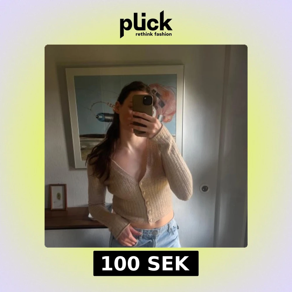 Säljer en stilren beige ribbad kofta med v-ringning och knappar framtill. Koftan är croppad och har långa ärmar, perfekt för en avslappnad look. Passar bra till jeans eller kjol. Köpt i butik i Italien!