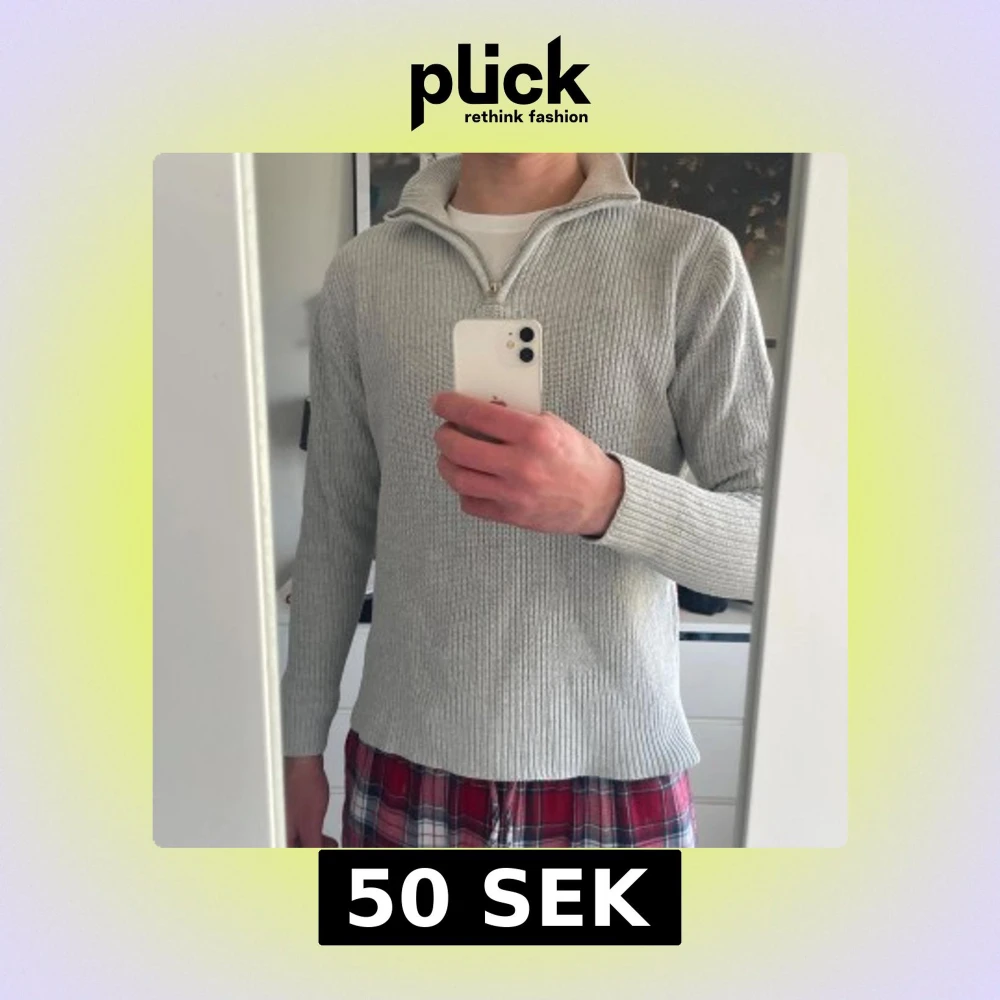 Säljer en ljusgrå stickad tröja med halv dragkedja i halsen. Tröjan har lång ärm och ribbad struktur, perfekt för lager-på-lager. Enkel och stilren design som passar till mycket.