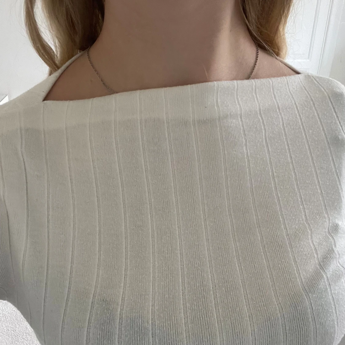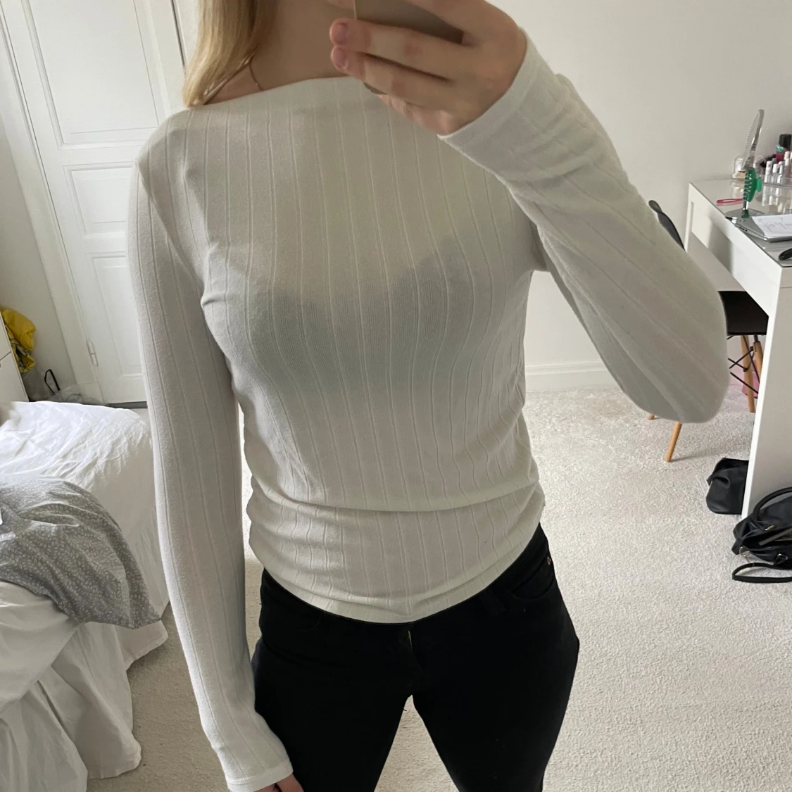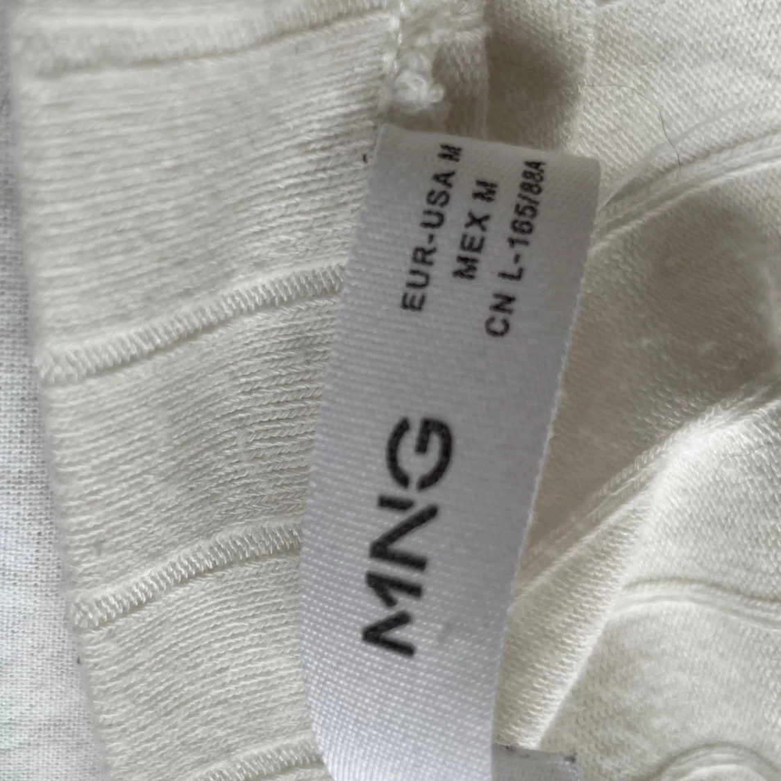 Säljer en vit långärmad tröja från MNG i storlek M. Tröjan har ett ribbat mönster och en snygg, rak båtringad hals. Materialet är mjukt och stretchigt, perfekt för dig som gillar stilrena och enkla plagg. Passformen är normal och sitter snyggt på kroppen.