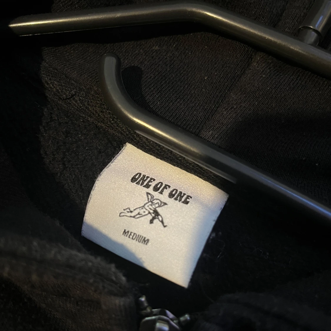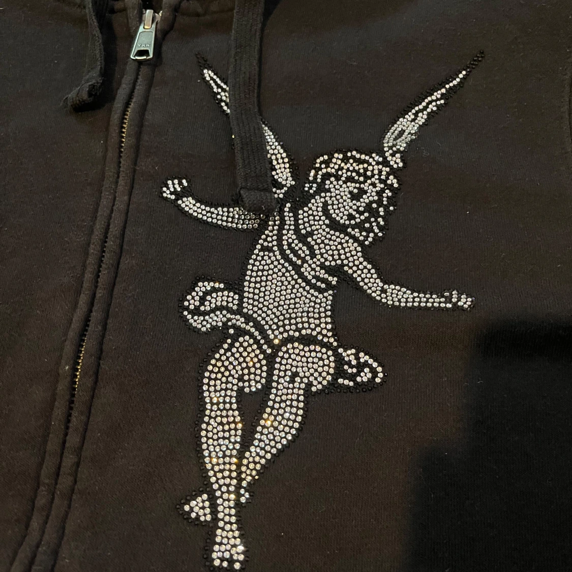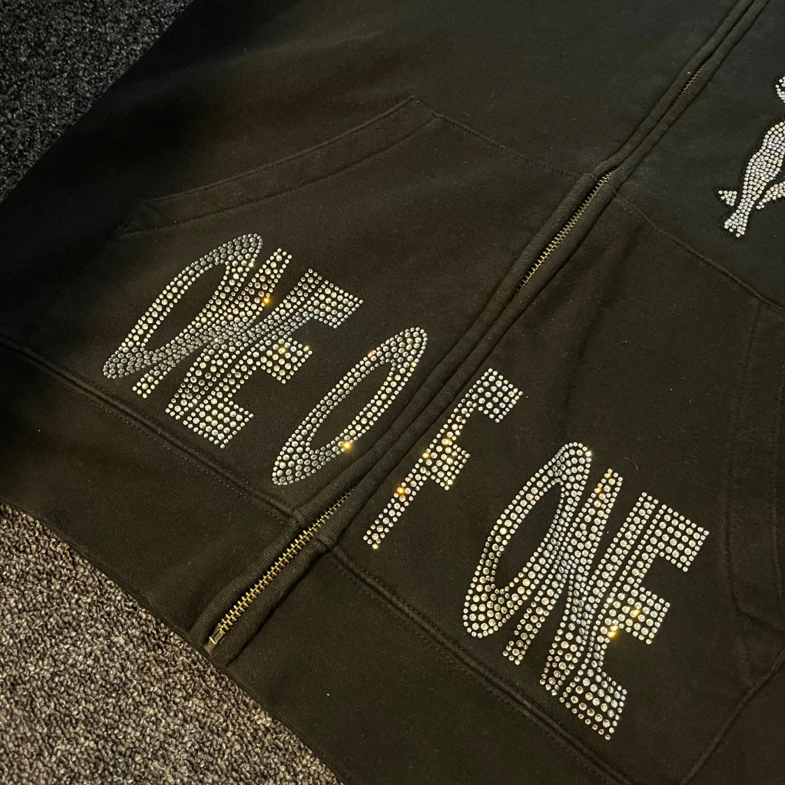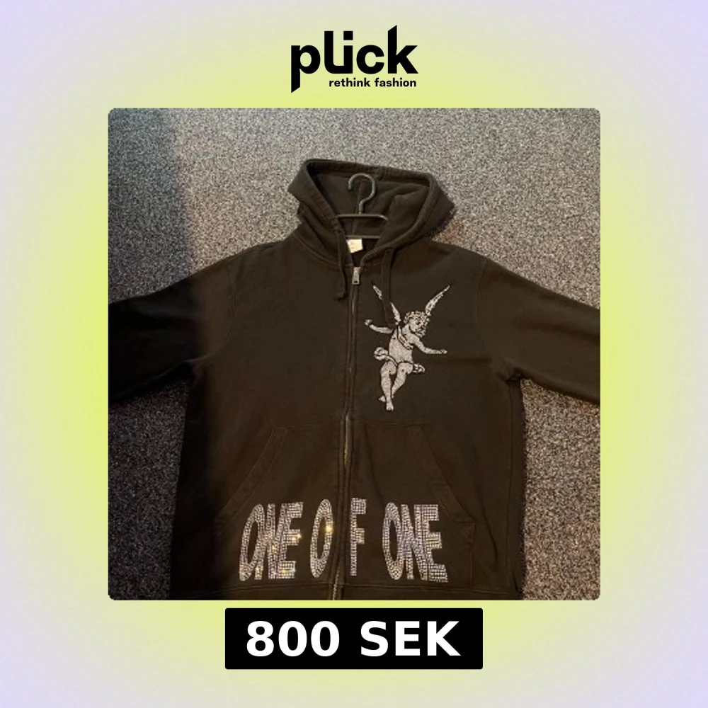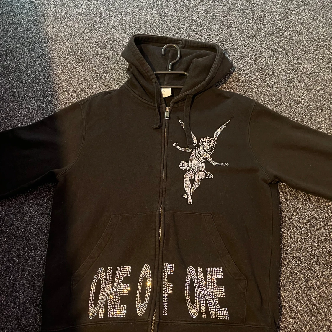Svart hoodie från One of One i storlek M med dragkedja, huva och känguruficka. Framsidan har en stor strassdekorerad ängel och texten 'ONE OF ONE' i glittriga stenar. Perfekt statement-plagg för dig som gillar unika detaljer.