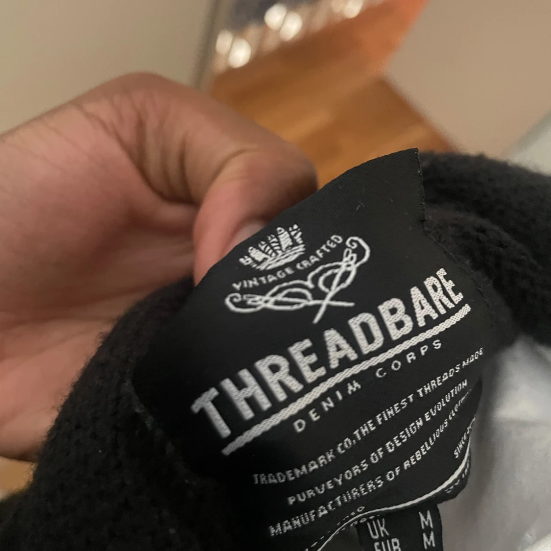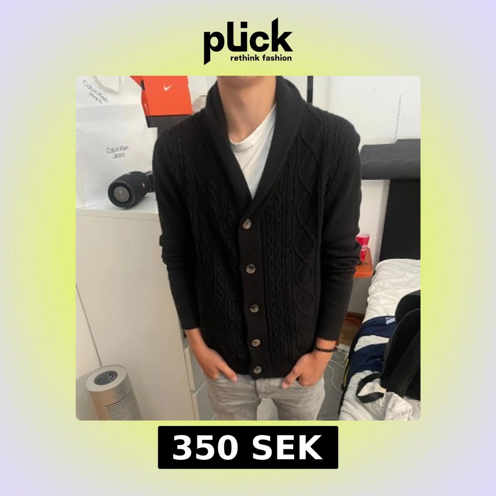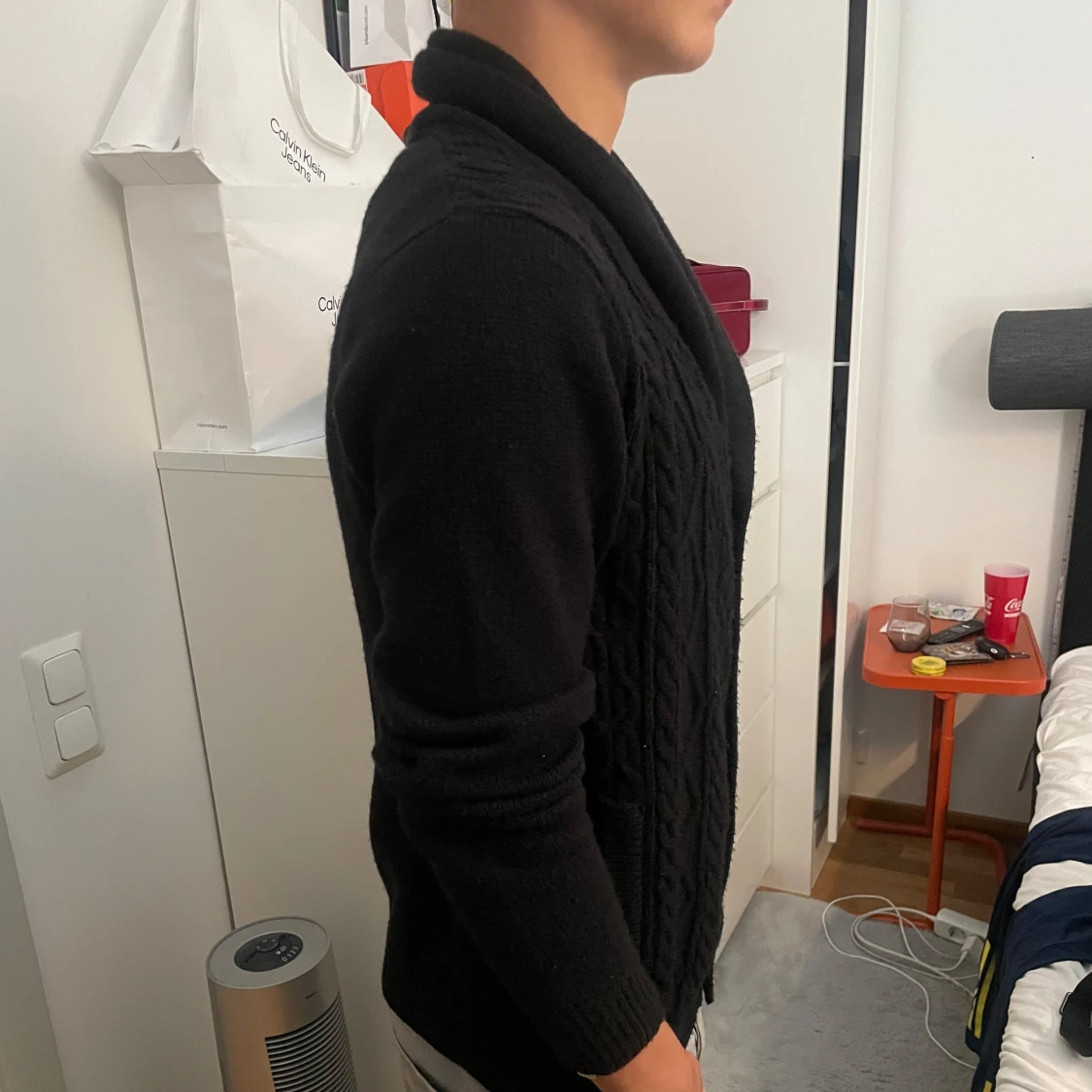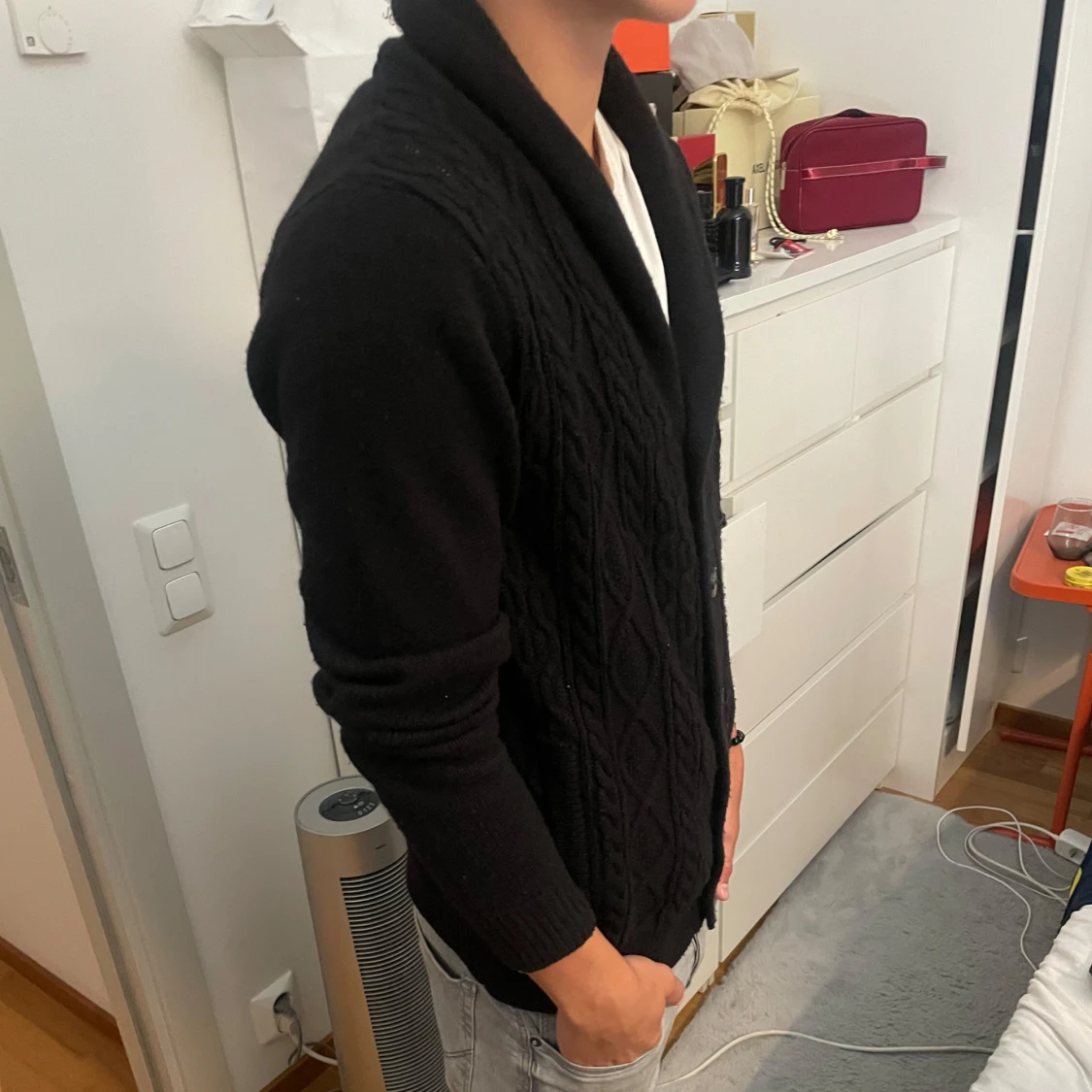 Svart stickad kofta från Threadbare med snyggt kabelstickat mönster och bred sjalkrage. Koftan har långa ärmar och stängs med fem knappar framtill. Perfekt för lager-på-lager och chill höst- och vinterstil.