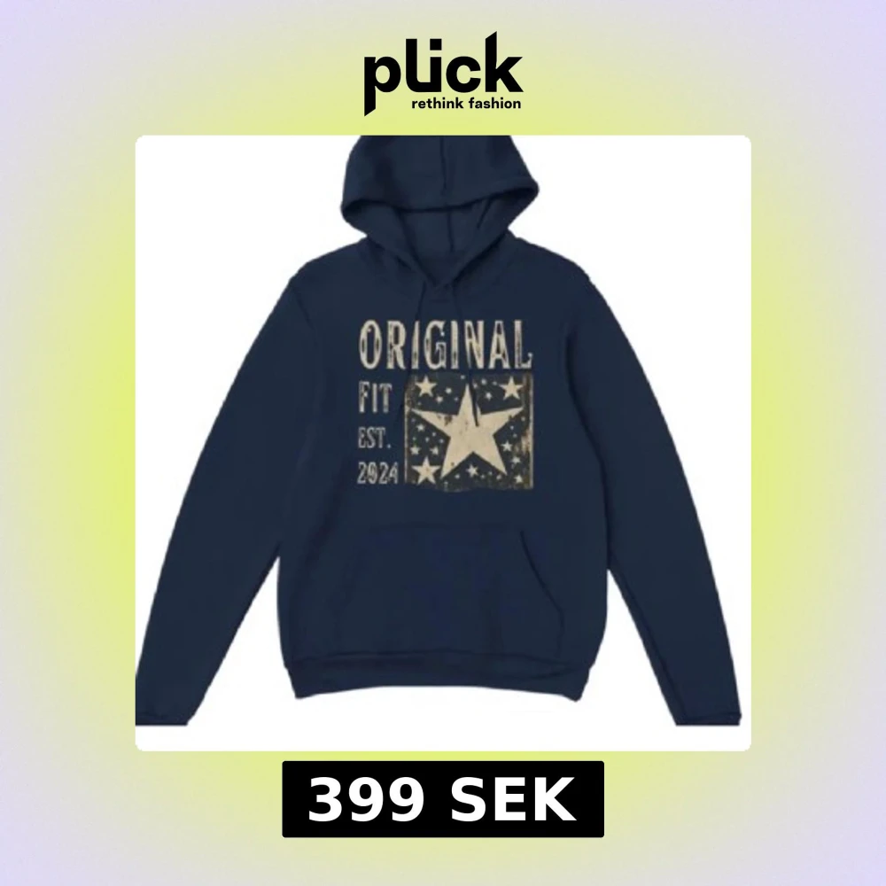 Snygg marinblå hoodie med huva och snörning. Framsidan har ett stort tryck med texten 'ORIGINAL FIT EST. 2024' och en stjärna omgiven av mindre stjärnor i beige. Perfekt för dig som gillar streetstyle och vill sticka ut.