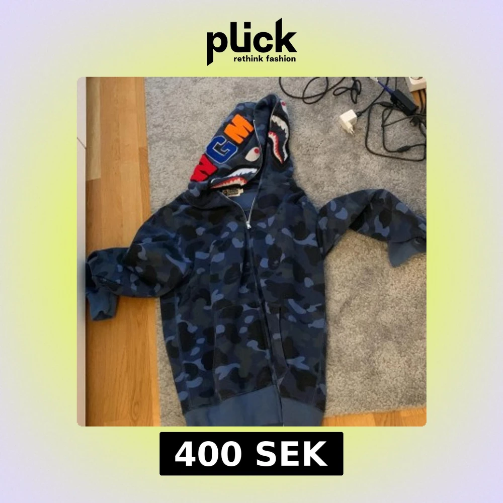 Säljer en ikonisk BAPE hoodie i blå camo med hajmotiv på huvan och broderade bokstäver. Tröjan har dragkedja hela vägen, känguruficka och är i mjuk bomull. Perfekt för dig som vill sticka ut med streetwear-vibe.
