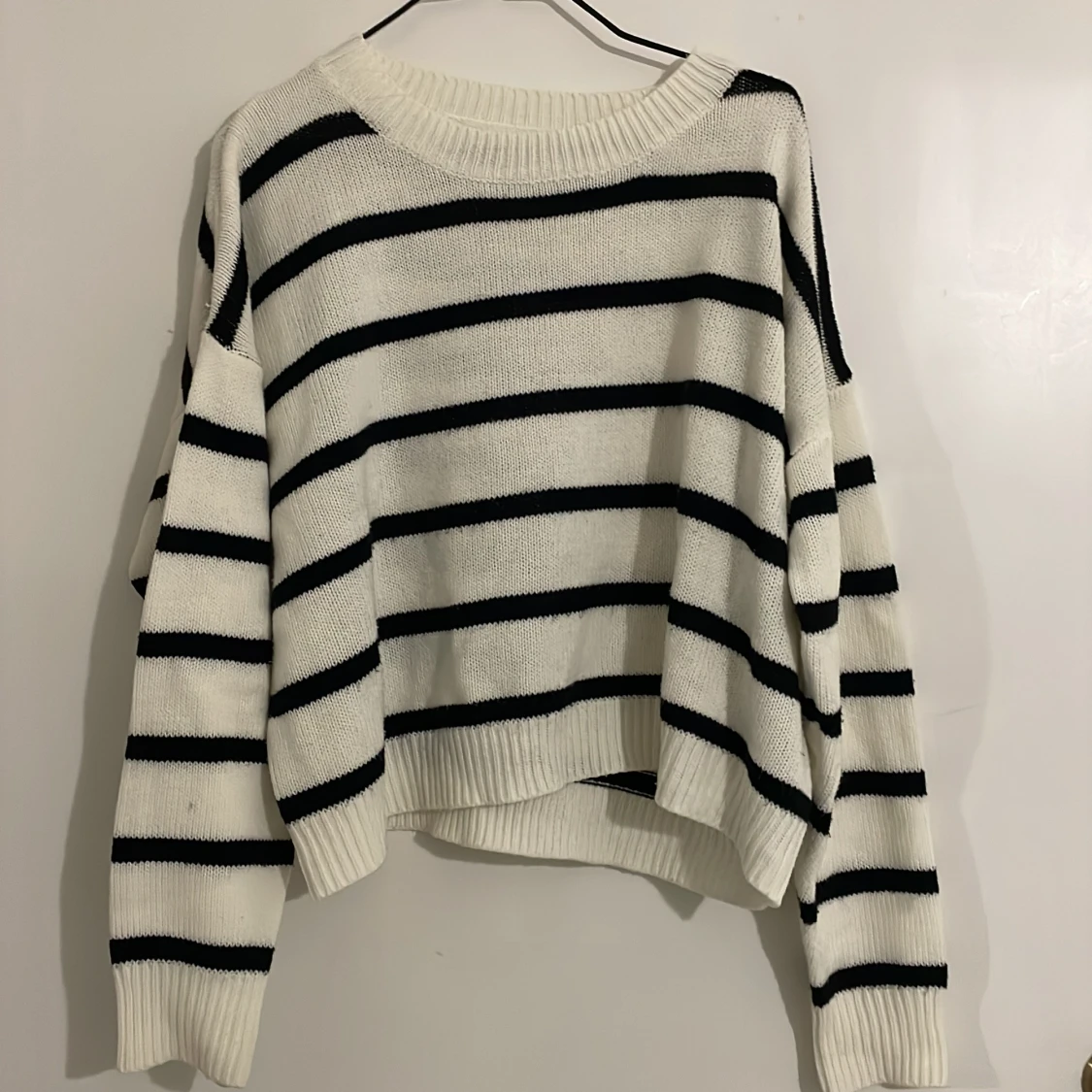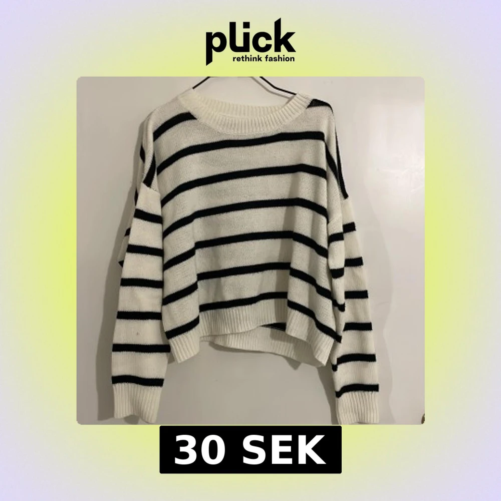 Säljer en mysig vit stickad tröja med svarta ränder. Tröjan har en avslappnad passform och långa ärmar, perfekt för kyligare dagar. Den är både stilren och bekväm, ett måste i garderoben!