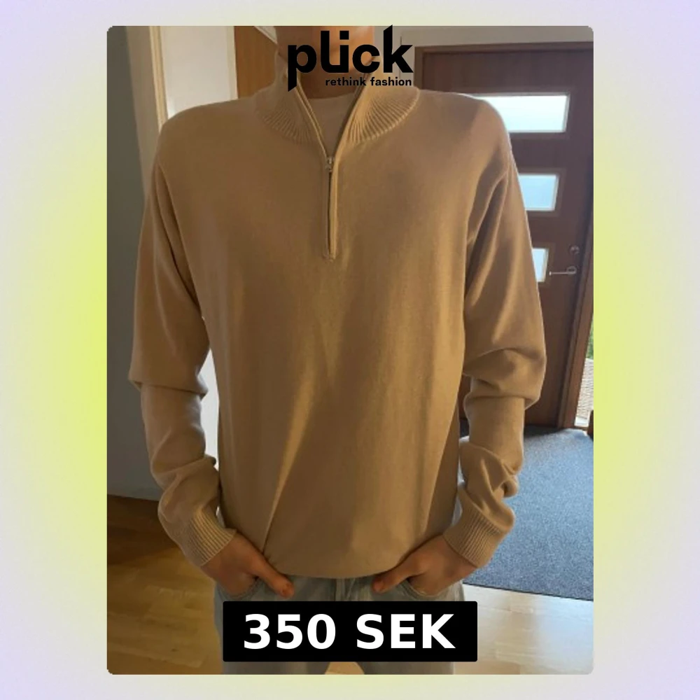 Snygg beige stickad tröja med half zip och ribbad krage. Tröjan har långärmade ärmar och en stilren design som passar perfekt till jeans. Materialet är mjukt och bekvämt, och den neutrala färgen gör den enkel att matcha med olika outfits.