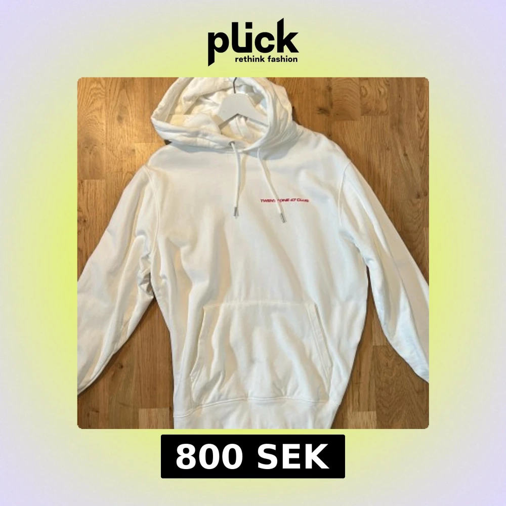 Vit hoodie från Victor Leksell med röd text 'TWENTY ONE 47 CLUB' på bröstet och stort körsbärstryck med gröna och gula detaljer på ryggen. Klassisk känguruficka och snörning i huvan. Perfekt statement-plagg för dig som gillar svensk pop. Helt ny använt endast 1 gång