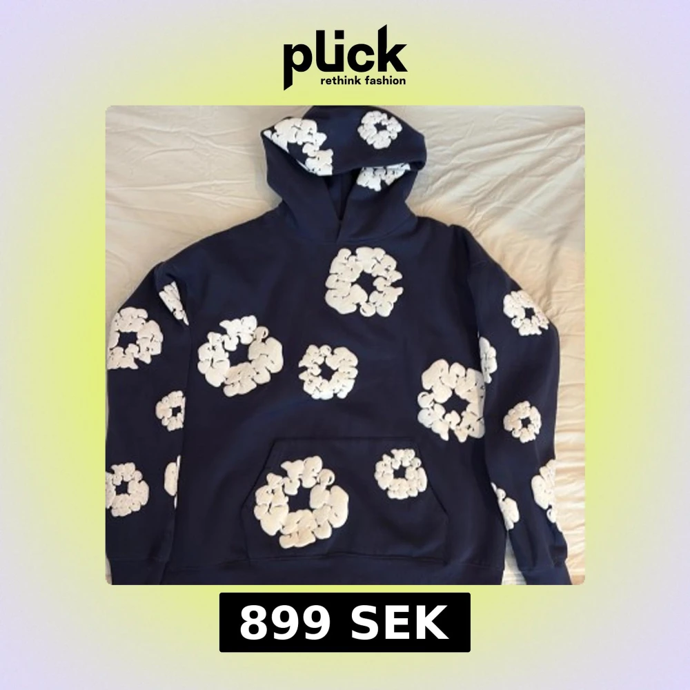 Säljer en mörkblå hoodie från Denim Tears i 100% bomull. Tröjan har vita blommiga mönster över hela och en stor huva. Klassisk känguruficka framtill och relaxed fit. Perfekt statement piece för dig som vill sticka ut.