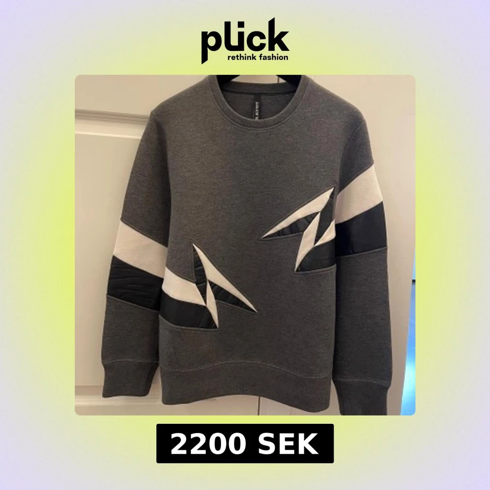 Säljer en grå sweatshirt från Neil Barrett med unika svarta och vita blixtdetaljer på bröstet och ärmarna. Tröjan har rund hals, lång ärm och är tillverkad i mjuk bomullsmix med inslag av quiltade partier för en cool kontrast.