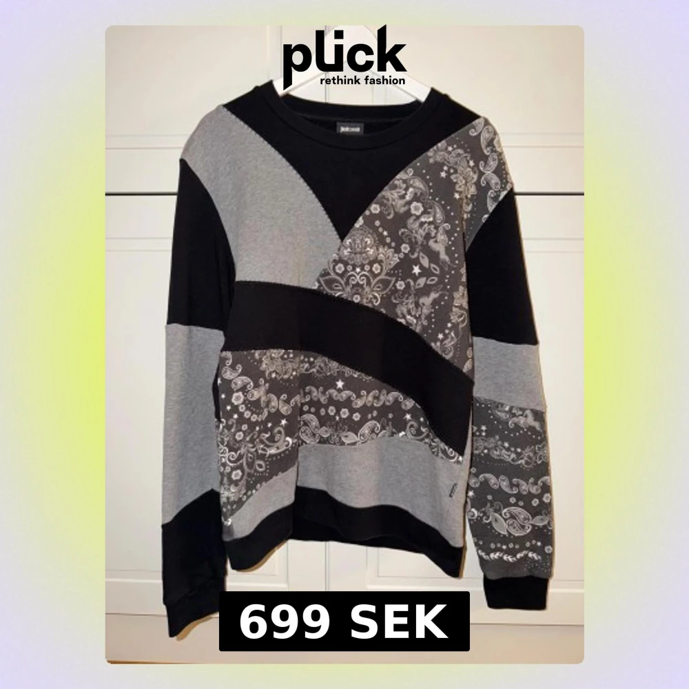 Unik sweatshirt från Just Cavalli i svart och grått med coolt paisley-inspirerat mönster. Tröjan har långärmade paneler och kontrasterande block i olika nyanser av grått och svart. Perfekt för dig som gillar streetstyle och vill sticka ut.